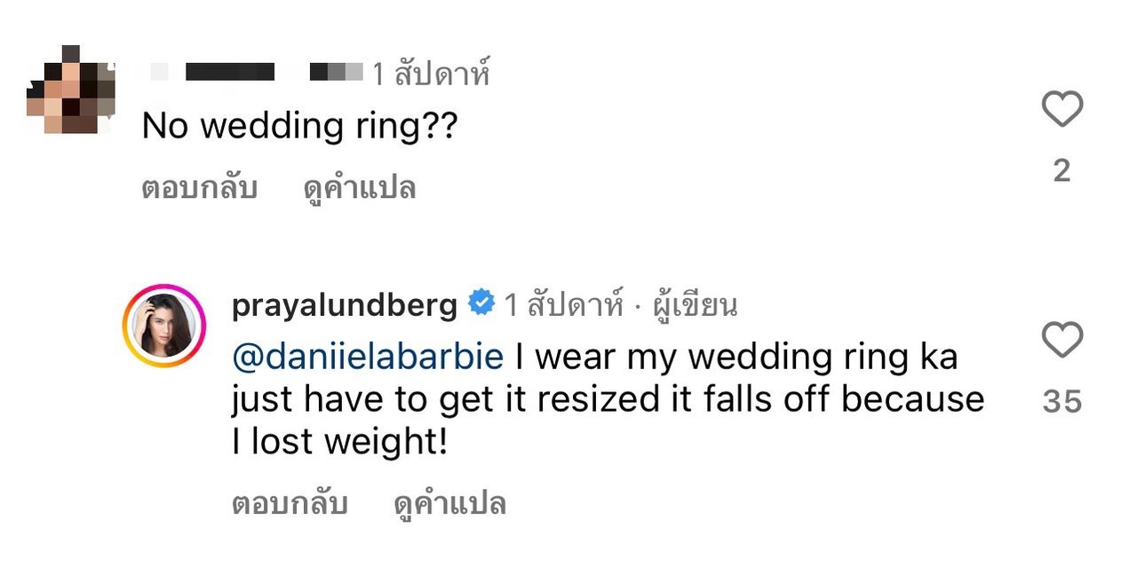 ซึ่งเธอได้เข้าไปตอบกลับคอมเมนต์นี้ว่า "I wear my wedding ring ka just have to get it resized it falls off because I lost weight!" (ฉันสวมแหวนแต่งงานอยู่ค่ะ เพียงแต่ต้องเอามาปรับขนาดใหม่ เพราะมันหลวมลงหลังจากที่ฉันลดน้ำหนัก).