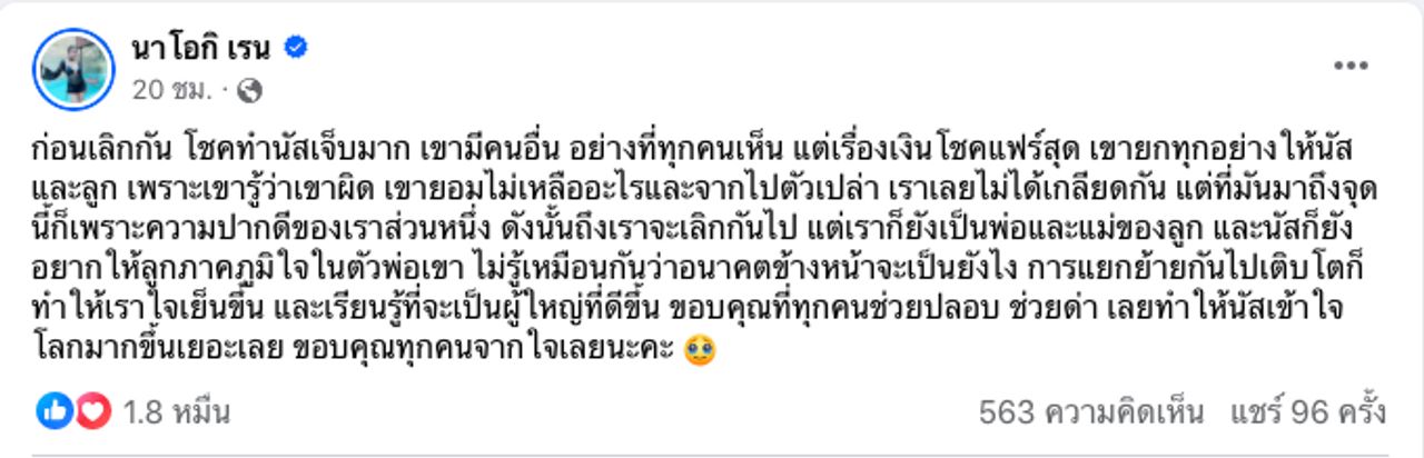 ล่าสุด อดีตภรรยาของโชค ก็ได้ออกมาโพสต์ข้อความถึงเรื่องราวหลังหย่ากันของทั้งคู่ให้ทุกคนได้รู้ว่าในอีกมุมของโชคนั้นเป็นอย่างไร แม้อีกฝ่ายจะปิดที่นอกใจกันผ่านทางเฟซบุ๊กว่า