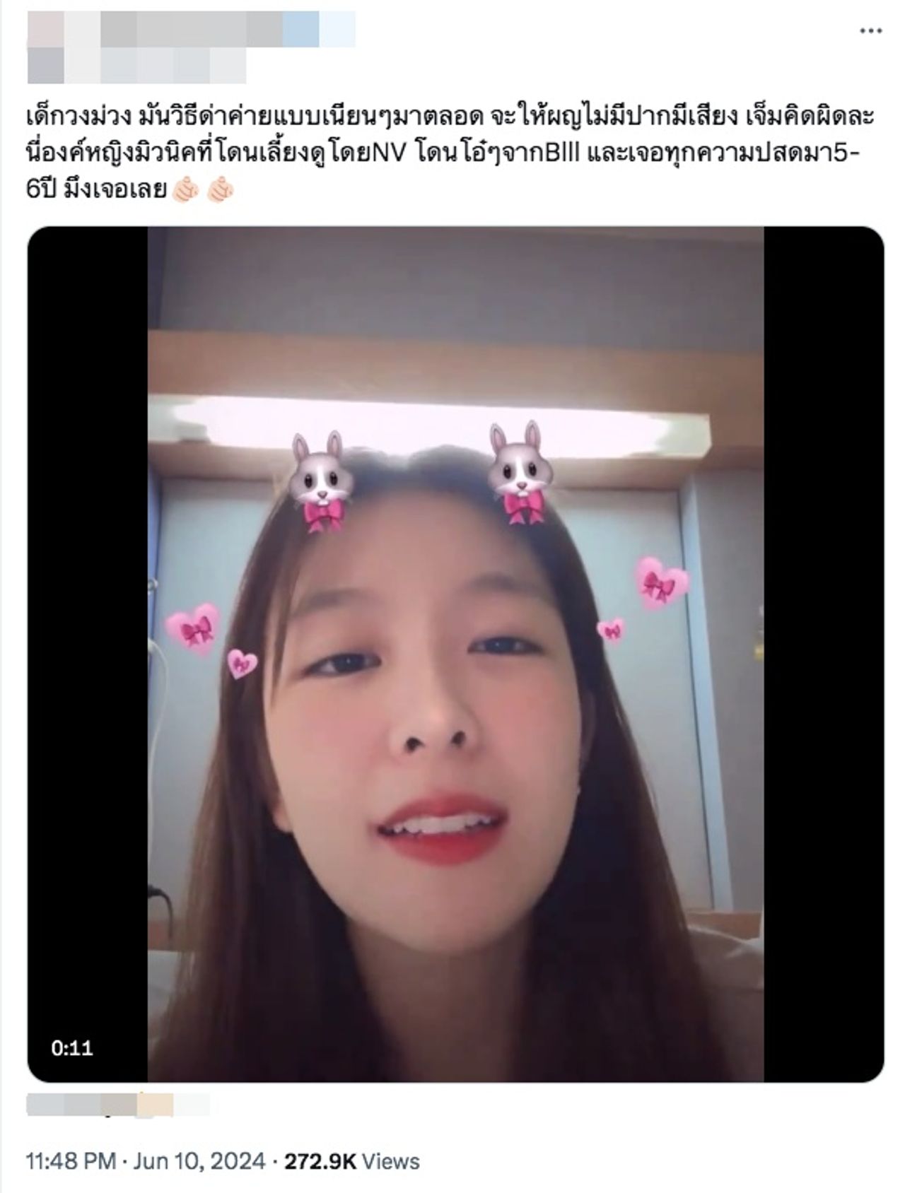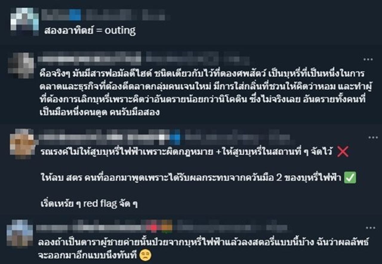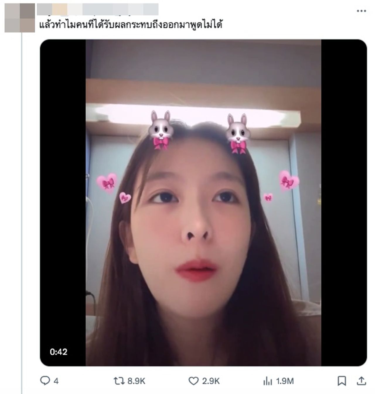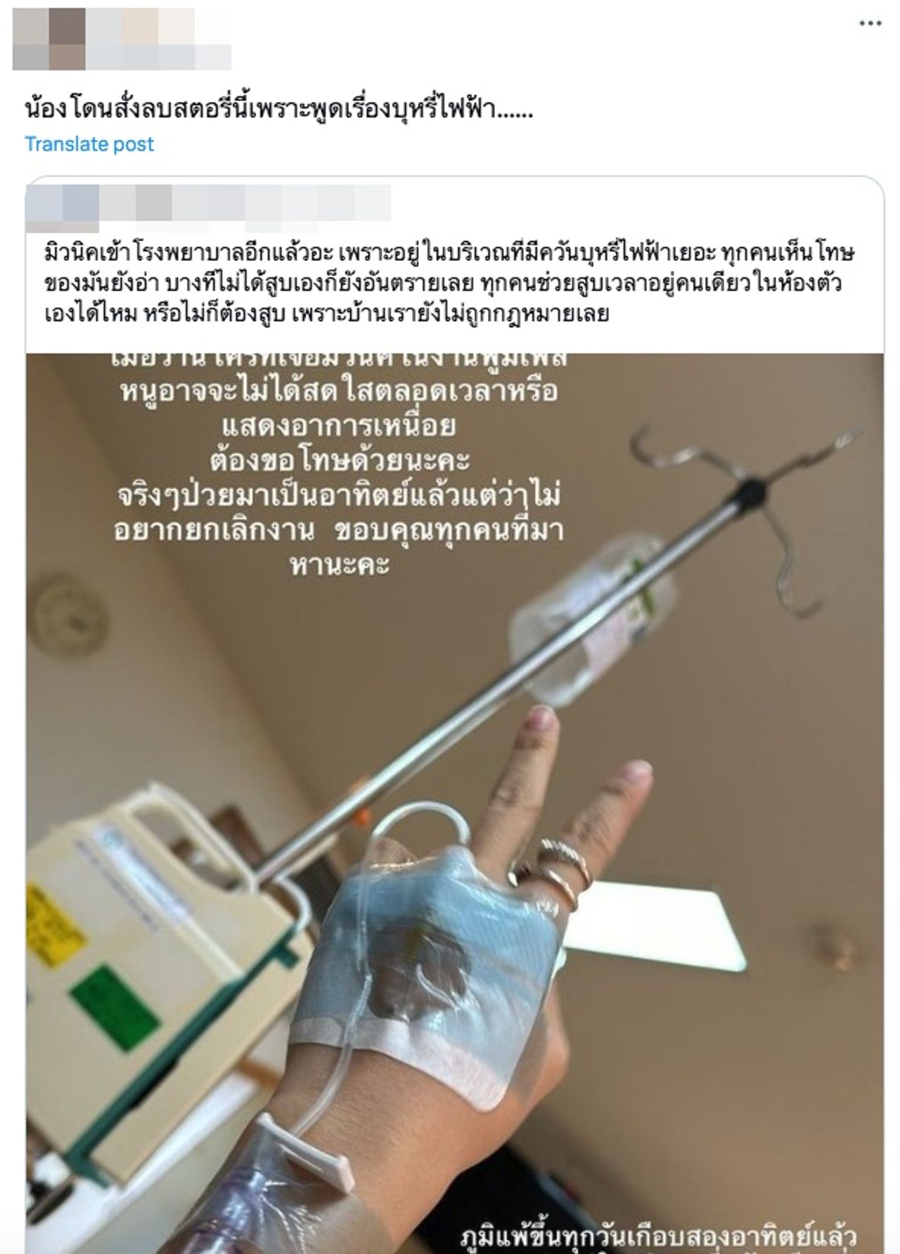 แต่หลังจากนั้นภาพดังกล่าวกลับถูกลบออกไป และไลฟ์สดบอกว่า “สตอรี่นั้นโดนสั่งให้ลบ เพราะว่าพูดถึงบุหรี่ไฟฟ้า ก็ขอขอบคุณชาว X (ทวิตเตอร์) ที่เห็นด้วยกับสิ่งที่หนูพูด ถึงแม้ว่าตอนนี้หนูจะโดนสั่งลบแล้วก็ตาม ขอขอบคุณทุกคนที่อวยพรให้หายดี และขอโทษด้วยที่ทำให้เป็นห่วง ที่ป่วยบ่อยๆ เราเองก็ไม่อยากป่วยเลย จริงๆ การพูดถึงเรื่องบุหรี่ไฟฟ้าก็คงมีอีกฝั่งที่ไม่เห็นด้วย และก็คงจะโดนว่าแหละ แต่ว่าไม่เป็นไร งั้นวันหลังหนูคิดว่าไม่พูดน่าจะดีกว่า”