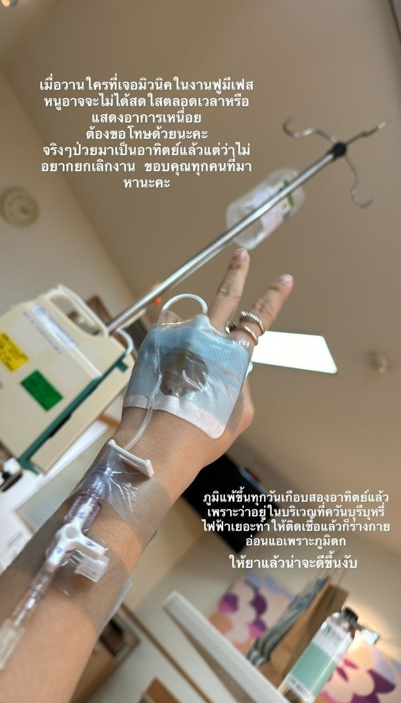 แต่ล่าสุด มิวนิค นันท์นภัส ได้โพสต์ภาพชู 2 นิ้ว และที่มือถูกเจาะสายน้ำเกลือลงในไอจีสตอรี่ พร้อมทั้งเขียนข้อความบอกว่า “เมื่อวานใครที่เจอมิวนิคในงานฟูมีเฟส หนูอาจจะไม่ได้สดใสตลอดเวลาหรือแสดงอาการเหนื่อย ต้องขอโทษด้วยนะคะ