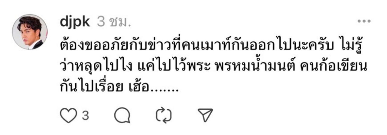 "ต้องขออภัยกับข่าวที่คนเม้าท์กันออกไปนะครับ ไม่รู้ว่าหลุดไปไง แค่ไปไหว้พระ พรมน้ำมนต์ คนก็เขียนกันไปเรื่อย เฮ้อ........".