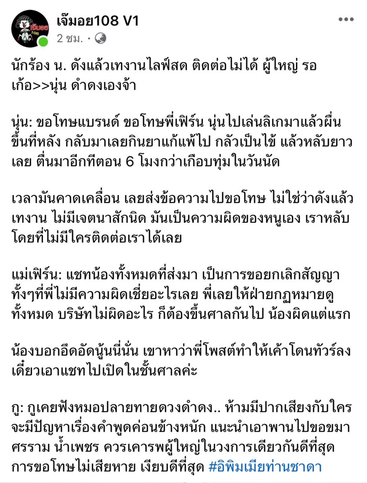 จากประเด็นที่ตัวแม่แห่งวงการออนไลน์ ได้ออกมาโพสต์ข้อความ นักร้อง น. ชื่อดัง เทงานไลฟ์สด ทีมงานติดต่อไม่ได้ ทำให้เกิดความเสียหาย ผู้ใหญ่ และ CEO ต้องมานั่งรอตั้งนาน