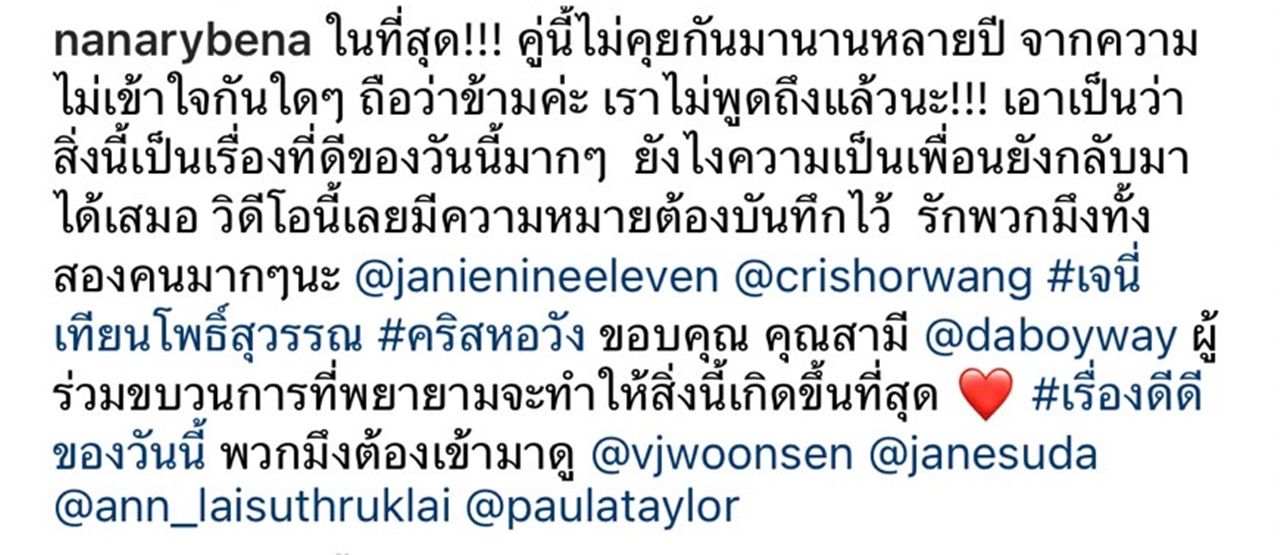 "ในที่สุด!!! คู่นี้ไม่คุยกันมานานหลายปี จากความไม่เข้าใจกันใดๆ ถือว่าข้ามค่ะ เราไม่พูดถึงแล้วนะ!!! เอาเป็นว่าสิ่งนี้เป็นเรื่องที่ดีของวันนี้มากๆ ยังไงความเป็นเพื่อนยังกลับมาได้เสมอ วิดีโอนี้เลยมีความหมายต้องบันทึกไว้ รักพวกมึงทั้งสองคนมากๆ นะ @janienineeleven @crishorwang #เจนี่เทียนโพธิ์สุวรรณ #คริสหอวัง ขอบคุณ คุณสามี @daboyway ผู้ร่วมขบวนการที่พยายามจะทำให้สิ่งนี้เกิดขึ้นที่สุด #เรื่องดีดีของวันนี้ พวกมึงต้องเข้ามาดู @vjwoonsen @janesuda @ann_laisuthruklai @paulataylor"