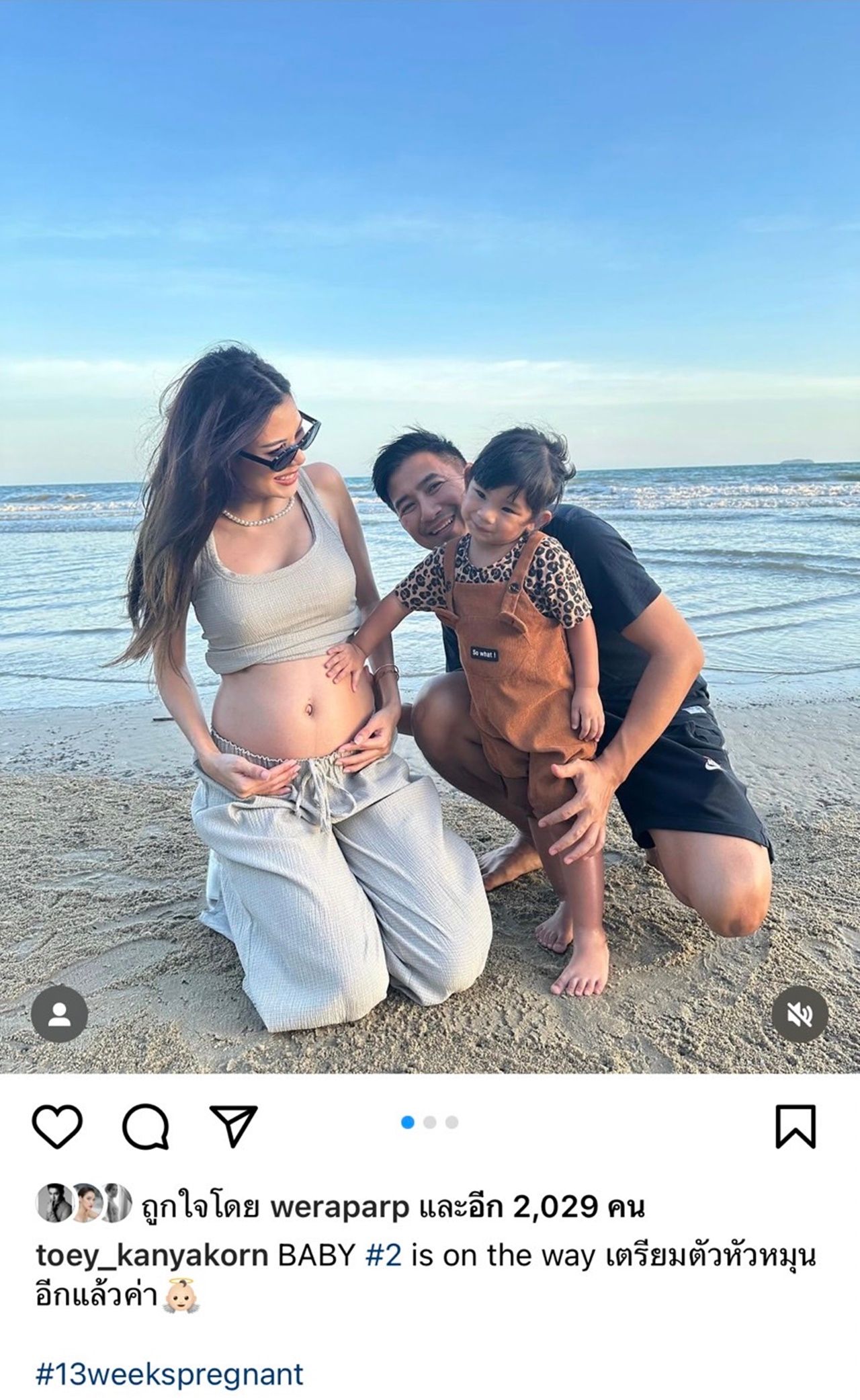 โดยเจ้าตัวได้โพสต์ภาพ 3 คนพ่อแม่ลูก พร้อมเขียนแคปชั่นบอกว่า "BABY #2 is on the way เตรียมตัวหัวหมุนอีกแล้วค่า #13weekspregnant"
