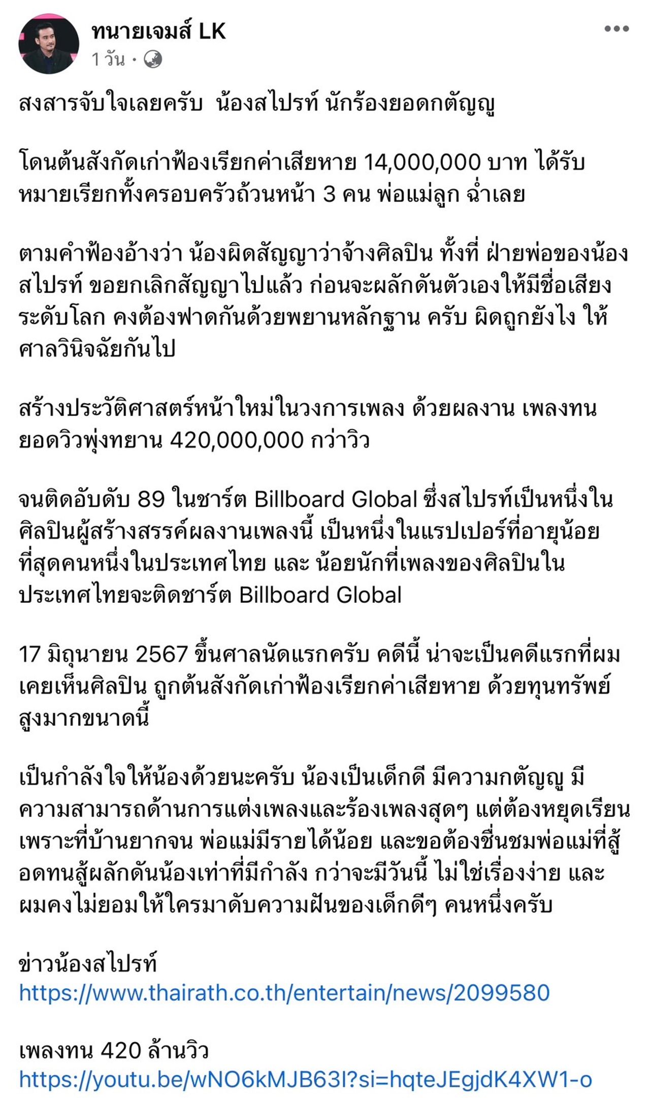 ซึ่งทาง ทนายเจมส์ นิติธร แก้วโต ได้โพสต์รายละเอียดผ่านเฟซบุ๊กส่วนตัว โดยระบุว่า "สงสารจับใจเลยครับ น้องสไปร์ท นักร้องยอดกตัญญู โดนต้นสังกัดเก่าฟ้องเรียกค่าเสียหาย 14,000,000 บาท ได้รับหมายเรียกทั้งครอบครัวถ้วนหน้า 3 คน พ่อแม่ลูก ฉ่ำเลย