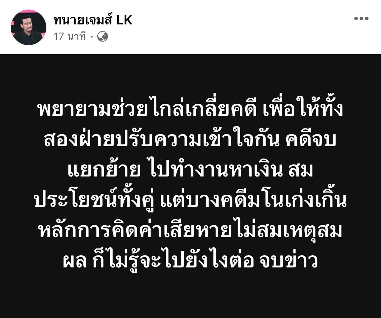 ล่าสุดวันนี้ (18 มิถุนายน 2567) ทนายเจมส์ ได้โพสต์ข้อความผ่านเฟซบุ๊ก โดยระบุว่า "พยายามช่วยไกล่เกลี่ยคดี เพื่อให้ทั้งสองฝ่ายปรับความเข้าใจกัน คดีจบ แยกย้าย ไปทำงานหาเงิน สมประโยชน์ทั้งคู่ แต่บางคดีมโนเก่งเกิ้น หลักการคิดค่าเสียหายไม่สมเหตุสมผล ก็ไม่รู้จะไปยังไงต่อ จบข่าว"