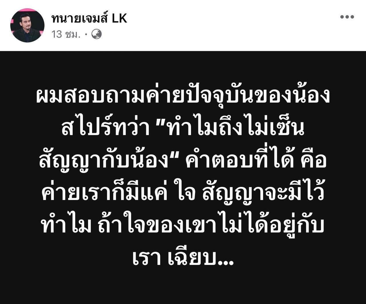 และอัปเดตความเคลื่อนไหวอีกครั้งว่า "ผมสอบถามค่ายปัจจุบันของน้องสไปร์ทว่า "ทำไมถึงไม่เซ็นสัญญากับน้อง" คำตอบที่ได้ คือ ค่ายเราก็มีแค่ ใจ สัญญาจะมีไว้ทำไม ถ้าใจของเขาไม่ได้อยู่กับเรา เฉียบ…"