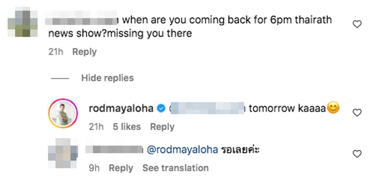 ซึ่งก่อนหน้านี้ รถเมล์ ก็ได้คอมเมนต์ตอบกลับแฟนๆ เอาไว้ว่า “ยังค่ะ เดี๋ยวอีกแป๊บนึงกลับไปอ่านนะคะ” แต่ล่าสุด ทำเอาแฟนๆ ตั้งหน้าตั้งตารอ เมื่อวันที่ 17 มิ.ย.ที่ผ่านมา รถเมล์ ได้ตอบกลับแฟนรายการที่ถามเข้ามาเรื่องการไปจัดรายการข่าวใส่ไข่ว่า “tomorrow kaaaa” ซึ่งก็หมายถึงวันที่ 18 มิ.ย.นั่นเอง