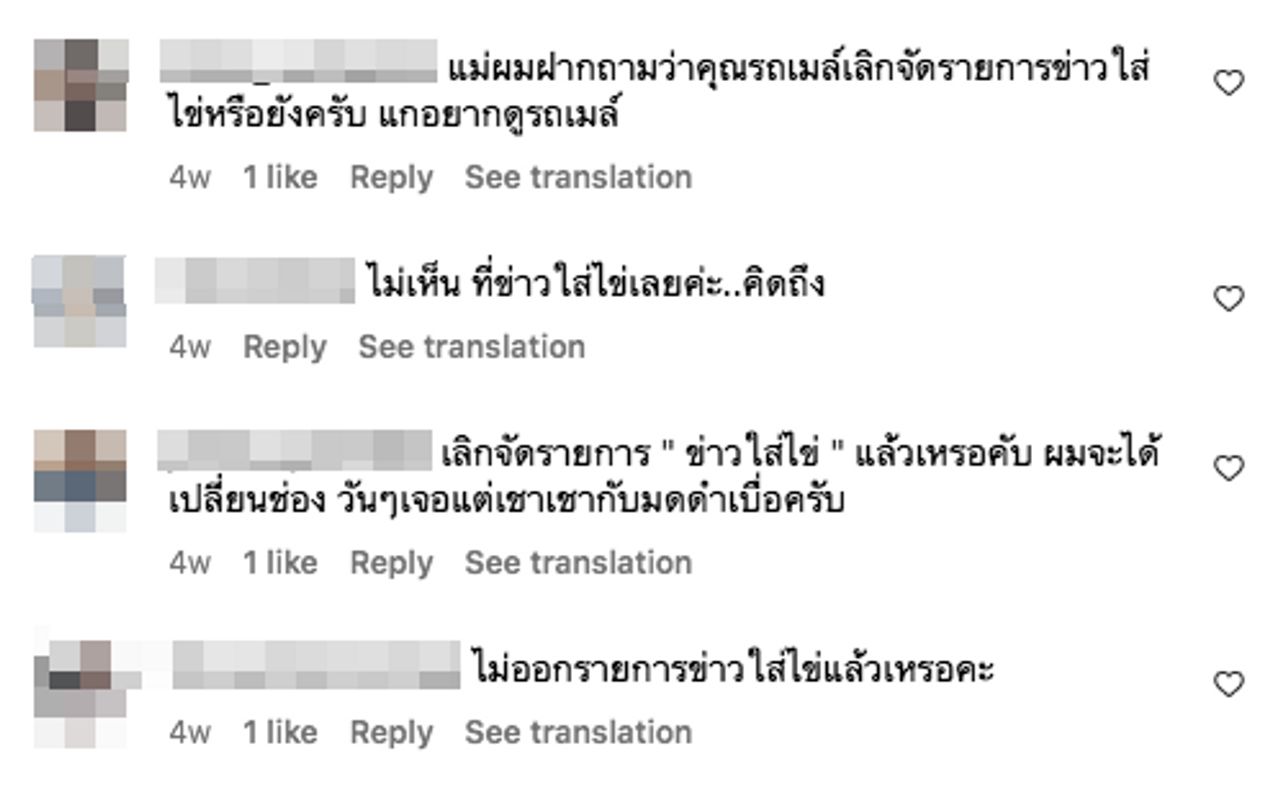 “คุณรถแมล์กำลังจะมีน้องหรือป่าวค่ะ หายไปนานเลย, รอดูข่าวใส่ไข่ ไม่เจอแล้วใจหายค่ะ, แม่ผมฝากถามว่าคุณรถเมล์เลิกจัดรายการข่าวใส่ไข่หรือยังครับ แกอยากดูรถเมล์, ไม่เห็น ที่ข่าวใส่ไข่เลยค่ะ..คิดถึง, คิดถึงแม่เมล์ละนะ ข่าวใส่ไข่ไม่เห็นหลายวันละ,