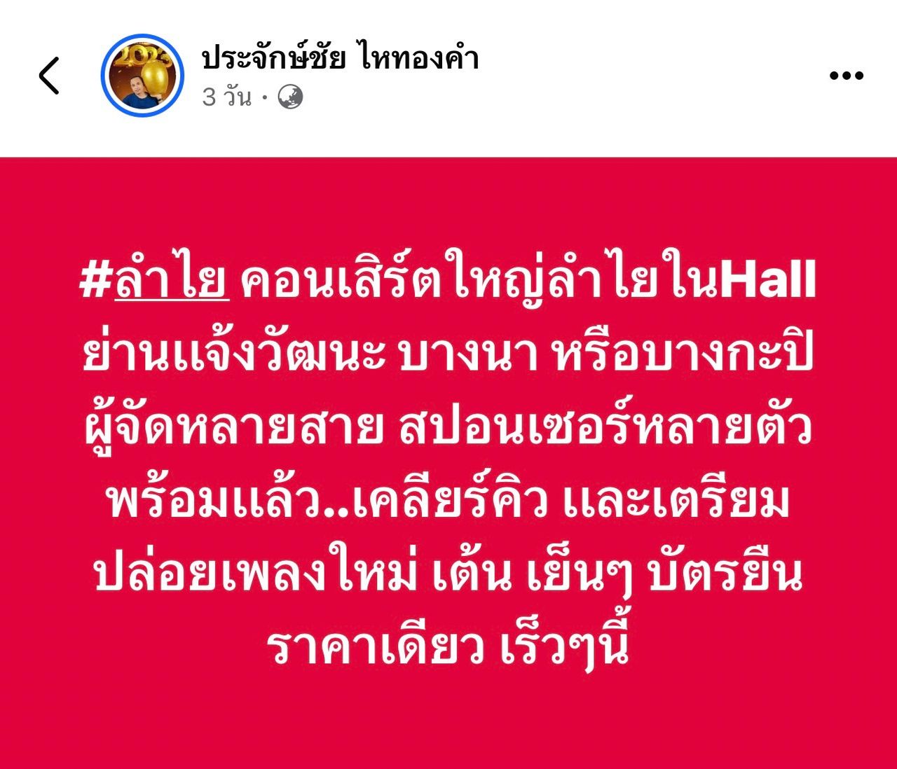 โดยระบุข้อความว่า "#ลำไย คอนเสิร์ตใหญ่ลำไยในHall ย่านแจ้งวัฒนะ บางนา หรือบางกะปิ ผู้จัดหลายสาย สปอนเซอร์หลายตัวพร้อมแล้ว..เคลียร์คิว และเตรียมปล่อยเพลงใหม่ เต้น เย็นๆ บัตรยืน ราคาเดียว เร็วๆ นี้"