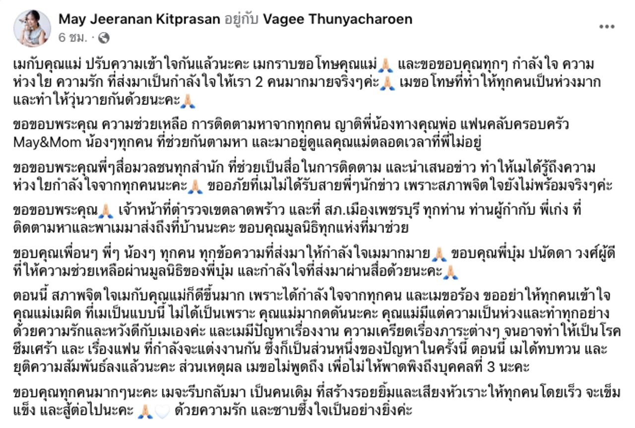 "...ตอนนี้ สภาพจิตใจเมกับคุณแม่ก็ดีขึ้นมาก เพราะได้กำลังใจจากทุกคน และเมขอร้อง ขออย่าให้ทุกคนเข้าใจคุณแม่เมผิด ที่เมเป็นแบบนี้ ไม่ได้เป็นเพราะคุณแม่มากดดันนะคะ คุณแม่มีแต่ความเป็นห่วงและทำทุกอย่างด้วยความรักและหวังดีกับเมเองค่ะ และเมมีปัญหาเรื่องงาน ความเครียดเรื่องภาระต่างๆ จนอาจทำให้เป็นโรคซึมเศร้า และเรื่องแฟน ที่กำลังจะแต่งงานกัน ซึ่งก็เป็นส่วนหนึ่งของปัญหาในครั้งนี้ ตอนนี้เมได้ทบทวน และยุติความสัมพันธ์ลงแล้วนะคะ ส่วนเหตุผล เมขอไม่พูดถึง เพื่อไม่ให้พาดพิงถึงบุคคลที่ 3 นะคะ..."