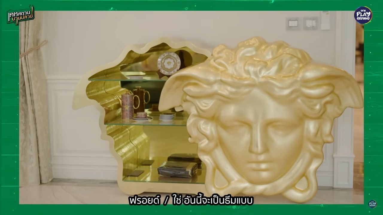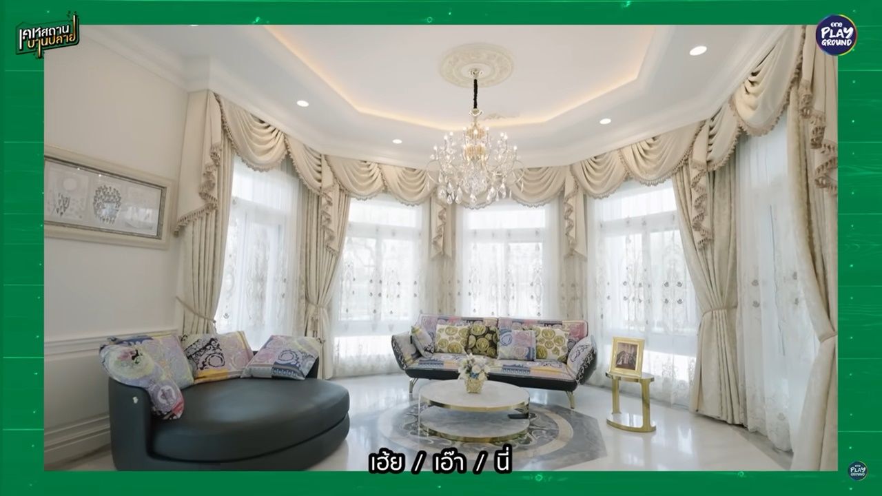 ห้องรับแขกแน่นไปด้วยเฟอร์นิเจอร์แบรนด์หรูราคาไม่ต่ำกว่าหลักล้านทั้ง 2 ห้อง แค่โต๊ะกลางที่เป็นกระเป๋า LOUIS VUITTON ก็ราคาหลักสิบล้าน หัวโต๊ะแบรนด์ Versace ราคา 2 ล้านบาท ซึ่งเป็นลิมิเต็ด เฟอร์นิเจอร์ทั้งชุด 4 ล้านบาท โดยรวมๆ ราคาห้องรับแขกอยู่ที่ประมาณ 30 ล้านบาท