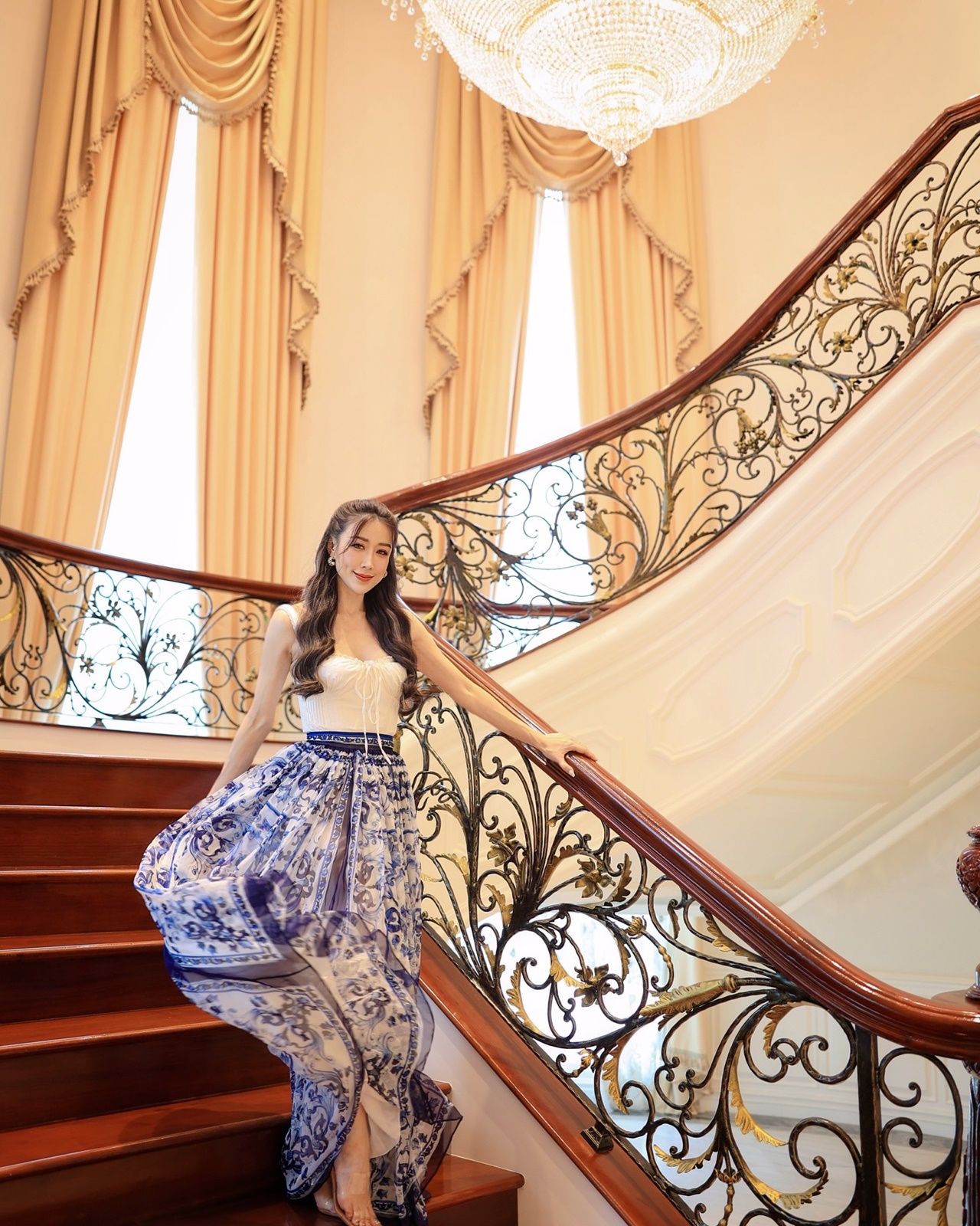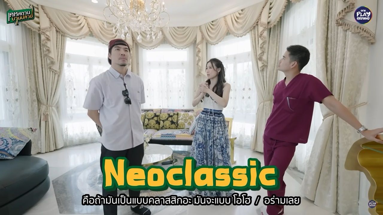 เอิร์น บอกว่า บ้านหลังนี้ตกแต่งในสไตล์ Neoclassic ไม่ได้เป็นสีทองจ๋า แต่จะมีสีขาวทองผสมกัน ให้ดูแล้วสบายตามากที่สุด หากเข้ามาในบ้านสิ่งที่สะดุดตามากที่สุดเห็นจะเป็น แชนเดอเลียร์ ที่นำเข้าจากยุโรป มูลค่าอันละ 10 ล้านบาท ส่วนพื้นบ้านเป็นหินแท้ที่ใช้น้ำตัด ราคามูลค่าเกือบ 100 ล้าน เพราะเป็นหินแท้มาจากเหมือง และใช้ทั้งบ้าน