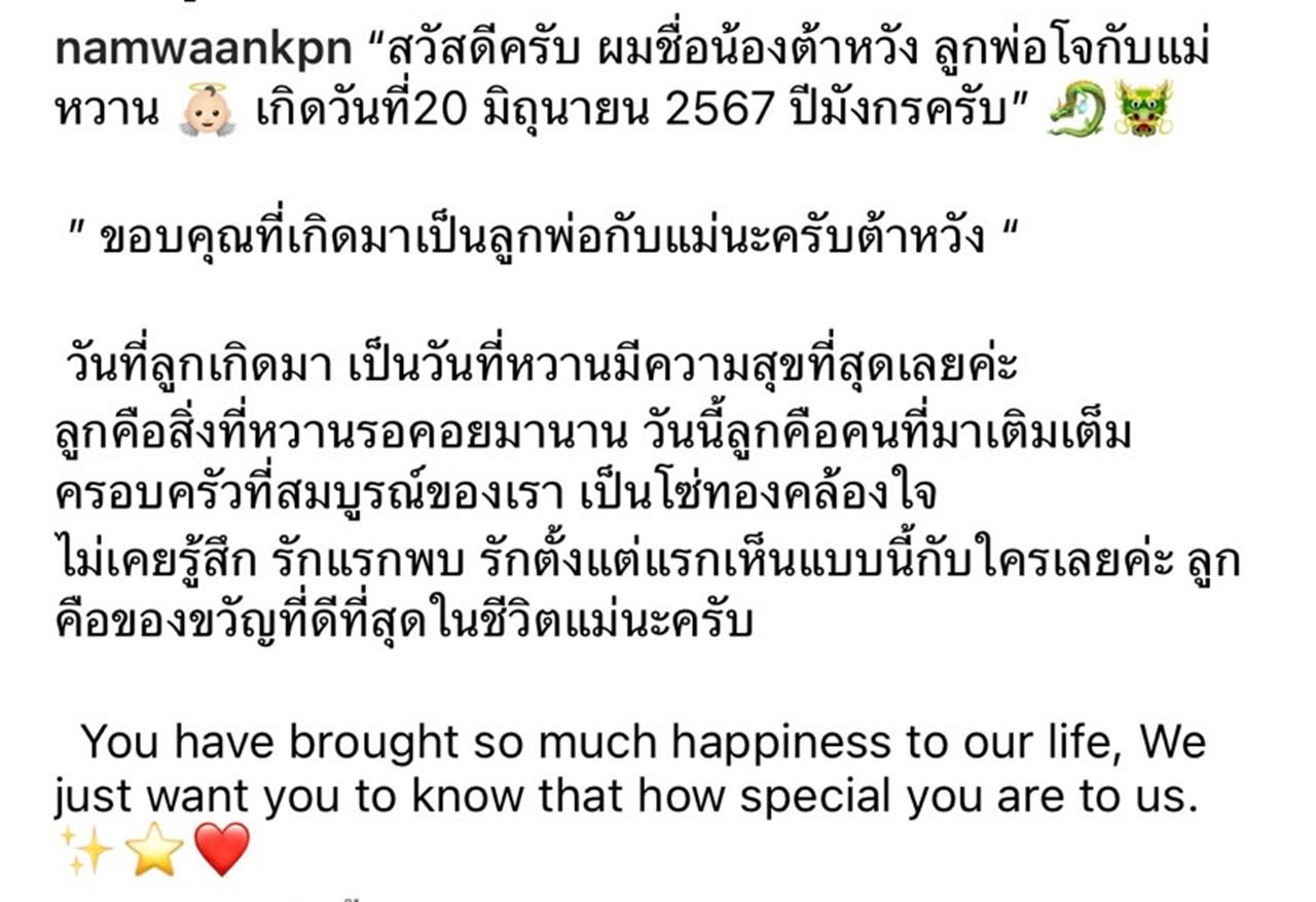 พร้อมเขียนแคปชั่น ระบุว่า "สวัสดีครับ ผมชื่อน้องต้าหวัง ลูกพ่อโจกับแม่หวาน เกิดวันที่ 20 มิถุนายน 2567 ปีมังกรครับ ขอบคุณที่เกิดมาเป็นลูกพ่อกับแม่นะครับต้าหวัง