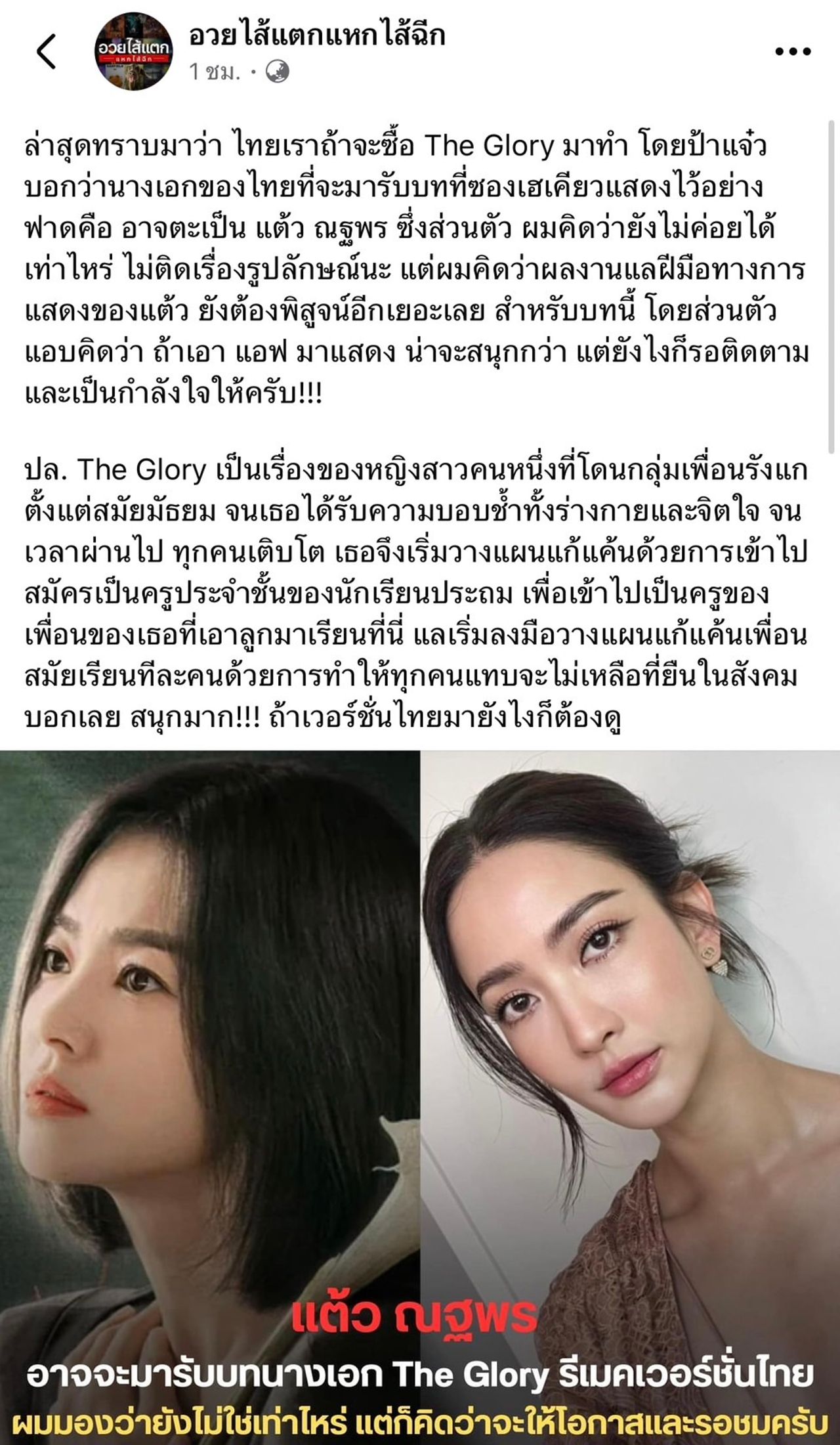 โดยข้อความดังกล่าวระบุว่า "ล่าสุดทราบมาว่า ไทยเราถ้าจะซื้อ The Glory มาทำ โดยป้าแจ๋ว บอกว่านางเอกของไทยที่จะมารับบทที่ซองเฮเคียวแสดงไว้อย่างฟาดคือ อาจจะเป็น แต้ว ณฐพร