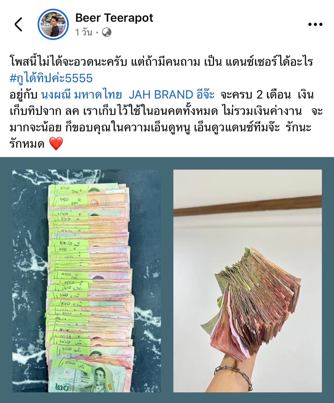 โดยระบุว่า "โพสต์นี้ไม่ได้จะอวดนะครับ แต่ถ้ามีคนถาม เป็น แดนเซอร์ได้อะไร #กูได้ทิปค่ะ555 อยู่กับ นงผณี มหาดไทย JAH BRAND อีจ๊ะ จะครบ 2 เดือน เงินเก็บทิปจาก ลค. เราเก็บไว้ใช้ในอนาคตทั้งหมด ไม่รวมเงินค่างาน จะมากจะน้อย ก็ขอบคุณในความเอ็นดูหนู เอ็นดูแดนซ์ทีมจ๊ะ รักนะ รักหมด"