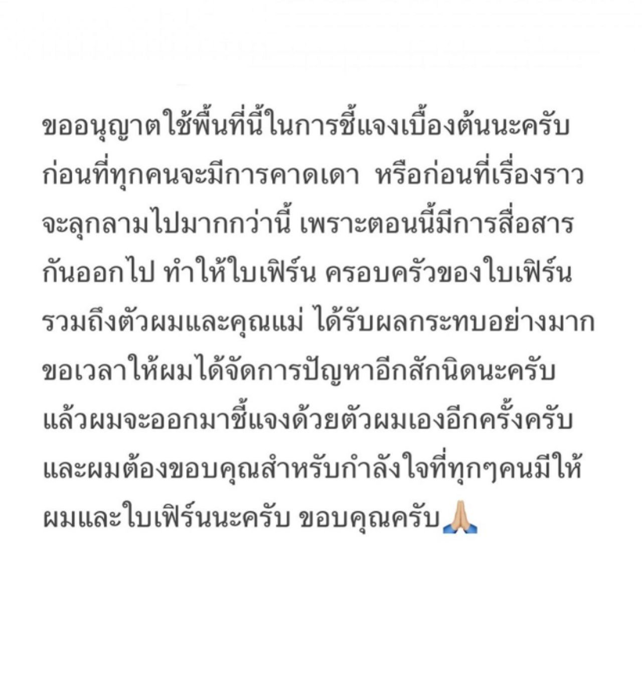 "ขออนุญาตใช้พื้นที่นี้ในการชี้แจงเบื้องต้นนะครับ ก่อนที่ทุกคนจะมีการคาดเดา หรือก่อนที่เรื่องราวจะลุกลามไปมากกว่านี้ เพราะตอนนี้มีการสื่อสารกันออกไป ทำให้ใบเฟิร์น ครอบครัวของใบเฟิร์น รวมถึงตัวผมและคุณแม่ได้รับผลกระทบอย่างมาก ขอเวลาให้ผมได้จัดการปัญหาอีกสักนิดนะครับ แล้วผมจะออกมาชี้แจงด้วยตัวผมเองอีกครั้งครับ และผมต้องขอบคุณสำหรับกำลังใจที่ทุกๆ คนมีให้ผมและใบเฟิร์นครับ ขอบคุณครับ"