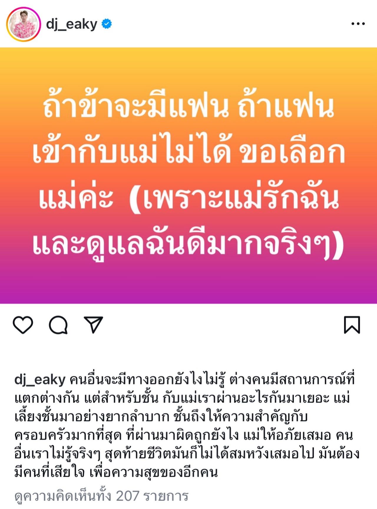 “ถ้าข้าจะมีแฟน ถ้าแฟนเข้ากับแม่ไม่ได้ ขอเลือก แม่ค่ะ (เพราะแม่รักฉันและดูแลฉันดีมากจริงๆ)” จากนั้น ดีเจเอกกี้ ก็ได้อธิบายเพิ่มเติมว่าหากเป็นตนเองที่อยู่ในสถานการณ์นั้น แล้วเลือกแม่ไว้ในแคปชั่นว่า