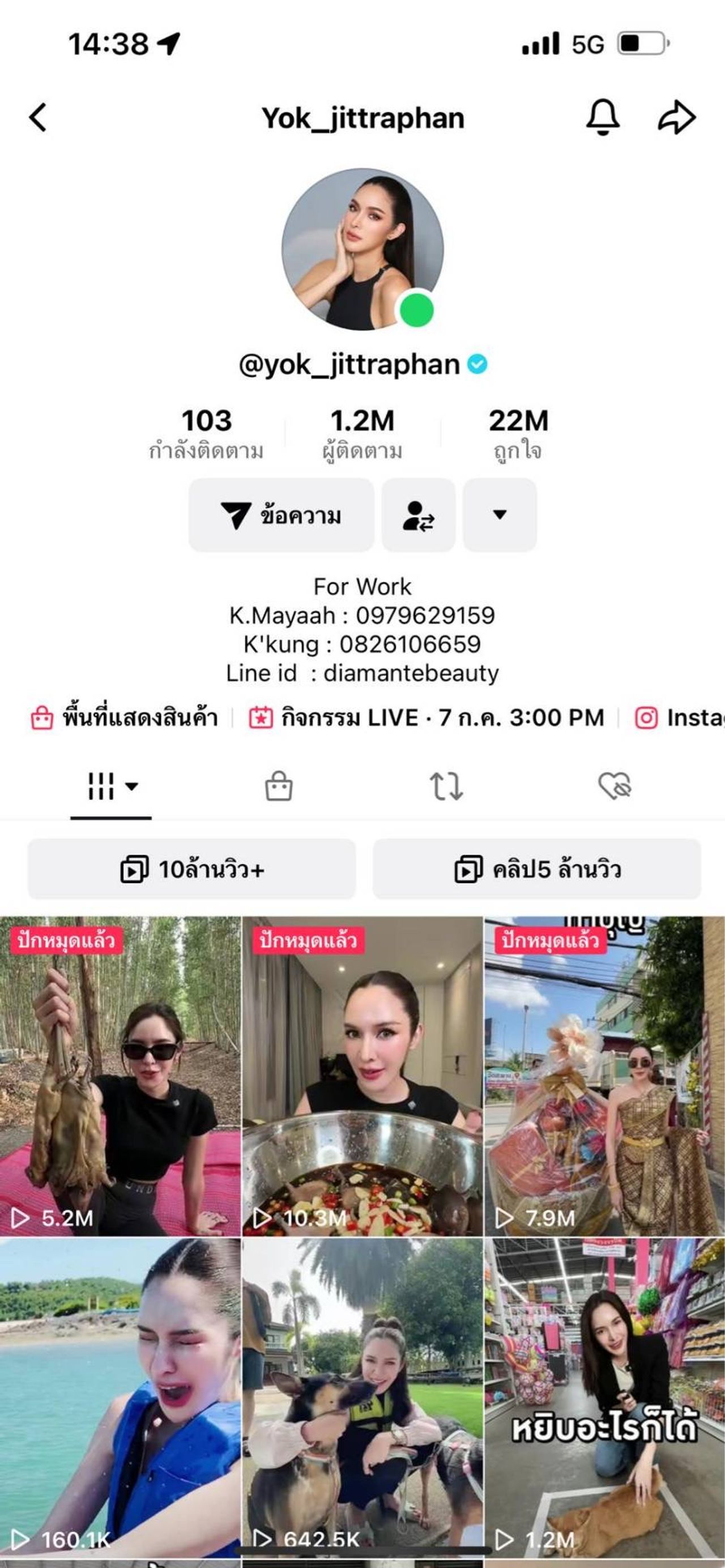 แถมยังมีผู้ติดตามบน TikTok กว่า 1.2 ล้านคน และเมื่อเข้าไปส่องไลฟ์สไตล์ของ “หยกทอง” ใน TikTok นอกจากจะได้เห็นความสวย ความแซ่บ ของเธอแล้ว แต่ละคลิปแต่ละคอนเทนต์ ของ “หยกทอง” ยอดวิวยังสูงที่เรียกว่า เกือบล้านวิวทุกคลิป ครบเครื่องสุดๆ ด้วยความสวยความสามารถที่มี ซึ่งต้องบอกว่าในขณะที่บางทีเธอไลฟ์สดขายของ ก็มีแฟนนางงามแห่ไปคอมเมนต์เชียร์กันรัวๆ อยากให้เธอลงประกวดนางงาม