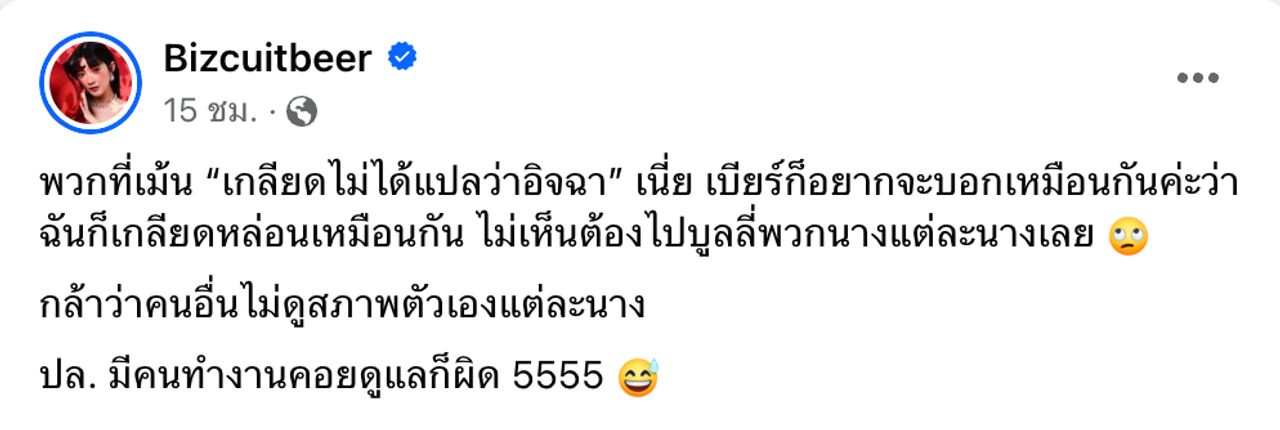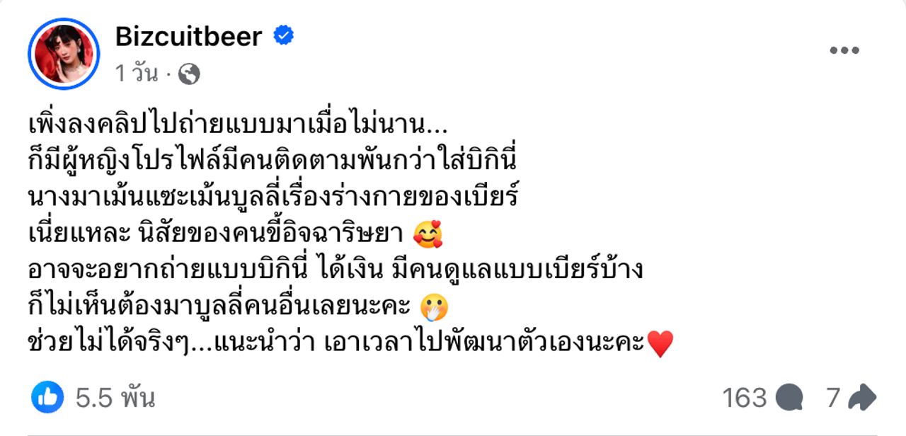 "เพิ่งลงคลิปไปถ่ายแบบมาเมื่อไม่นาน...ก็มีผู้หญิงโปรไฟล์มีคนติดตามพันกว่าใส่บิกินี่ นางมาเม้นแซะเม้นบูลลี่เรื่องร่างกายของเบียร์ เนี่ยแหละ นิสัยของคนขี้อิจฉาริษยา อาจจะอยากถ่ายแบบบิกินี่ ได้เงิน มีคนดูแลแบบเบียร์บ้าง ก็ไม่เห็นต้องมาบูลลี่คนอื่นเลยนะคะ ช่วยไม่ได้จริงๆ...แนะนำว่า เอาเวลาไปพัฒนาตัวเองนะคะ"