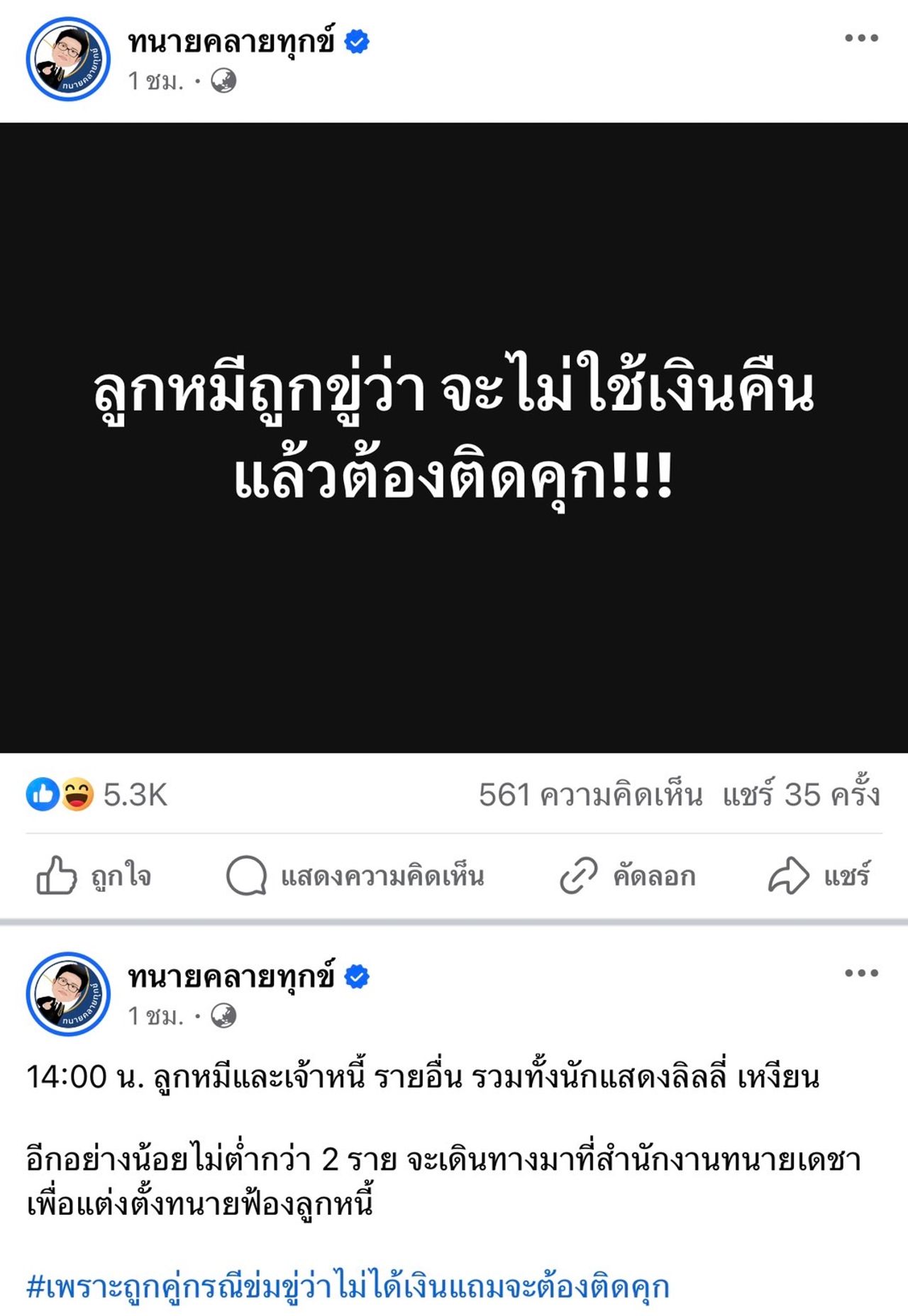 เผยข้อความระบุว่า "14:00 น. ลูกหมีและเจ้าหนี้รายอื่น รวมทั้งนักแสดงลิลลี่ เหงียน อีกอย่างน้อยไม่ต่ำกว่า 2 ราย จะเดินทางมาที่สำนักงานทนายเดชา เพื่อแต่งตั้งทนายฟ้องลูกหนี้ #เพราะถูกคู่กรณีข่มขู่ว่าไม่ได้เงินแถมจะต้องติดคุก"