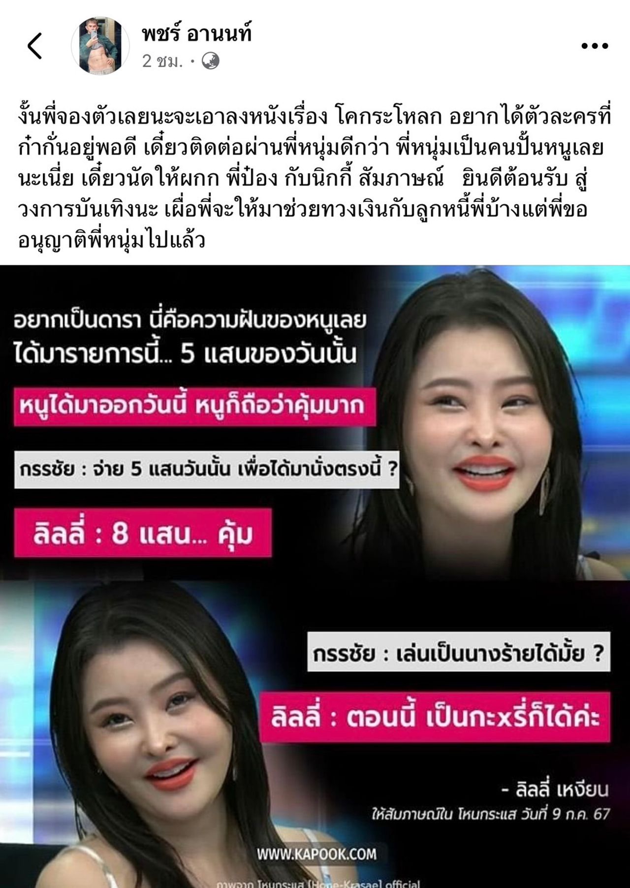 ล่าสุดผู้กำกับ-นักปั้นชื่อดัง พชร์ อานนท์ ได้ออกมาเคลื่อนไหวถึง ลิลลี่ เหงียน พร้อมช่วยสานฝันจะให้มาเล่นหนังด้วยกัน ซึ่งข้อความดังกล่าวระบุว่า "งั้นพี่จองตัวเลยนะจะเอาลงหนังเรื่อง โคกระโหลก อยากได้ตัวละครที่ก๋ากั่นอยู่พอดี