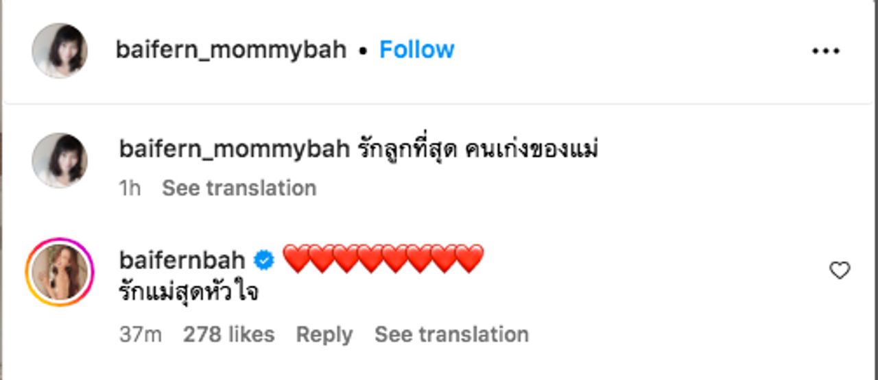 โดยคุณแม่ของใบเฟิร์นได้โพสต์รูป 3 คนพ่อแม่ลูก รวมไปถึงภาพที่ใบเฟิร์นกอดกับคุณแม่ พร้อมแคปชั่นสั้นๆ แต่อ่านแล้วน้ำตาแทบไหลว่า "รักลูกที่สุด คนเก่งของแม่" งานนี้ใบเฟิร์นได้เข้ามาคอมเมนต์ตอบกลับคุณแม่ด้วยว่า "รักแม่สุดหัวใจ" พร้อมด้วยอีโมจิหัวใจสีแดงอีกหลายดวง