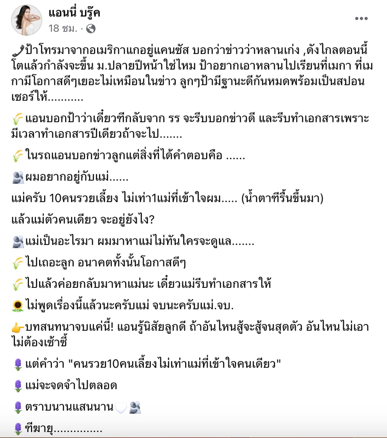 บทสนทนาจบแค่นี้! แอนรู้นิสัยลูกดี ถ้าอันไหนสู้จะสู้จนสุดตัว อันไหนไม่เอาไม่ต้องเซ้าซี้ แต่คำว่า "คนรวย 10 คนเลี้ยงไม่เท่าแม่ที่เข้าใจคนเดียว" แม่จะจดจำไปตลอด ตราบนานแสนนาน ฑีฆายุ..............."