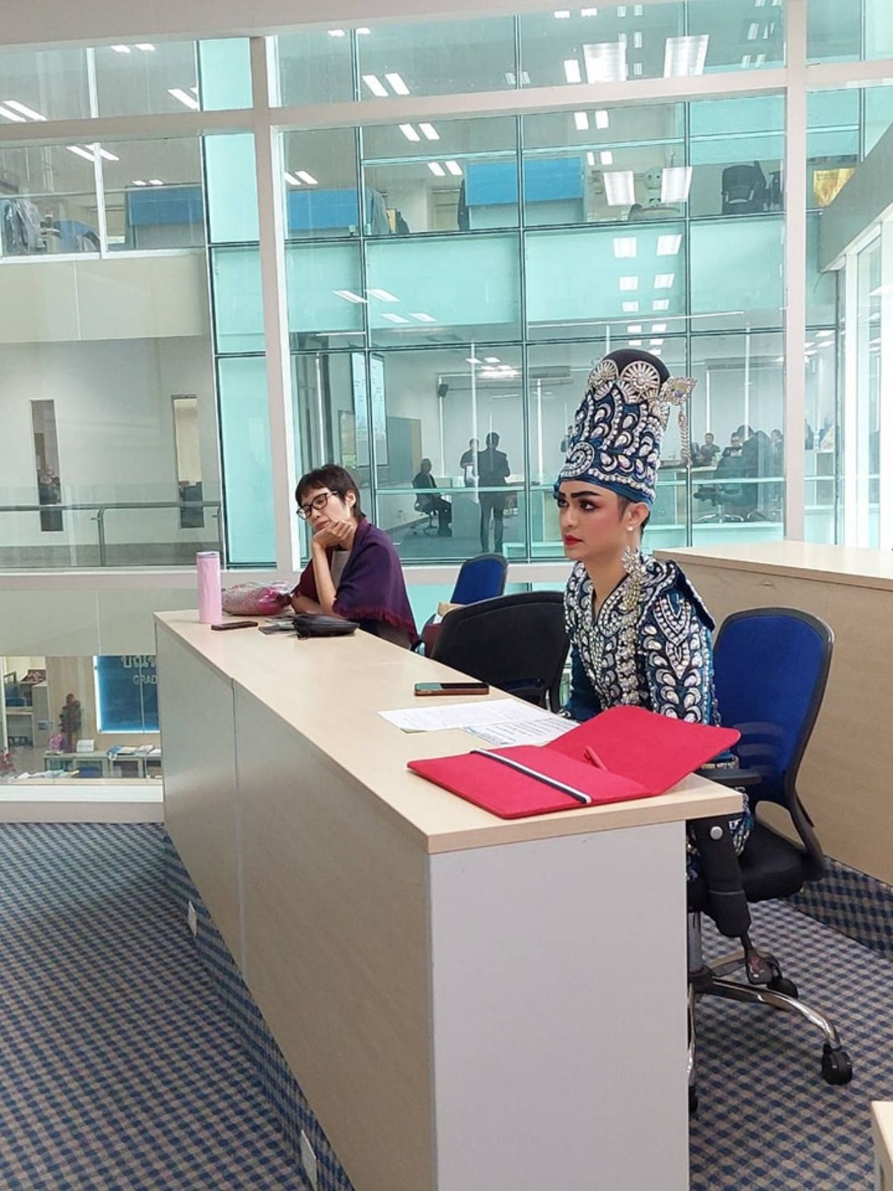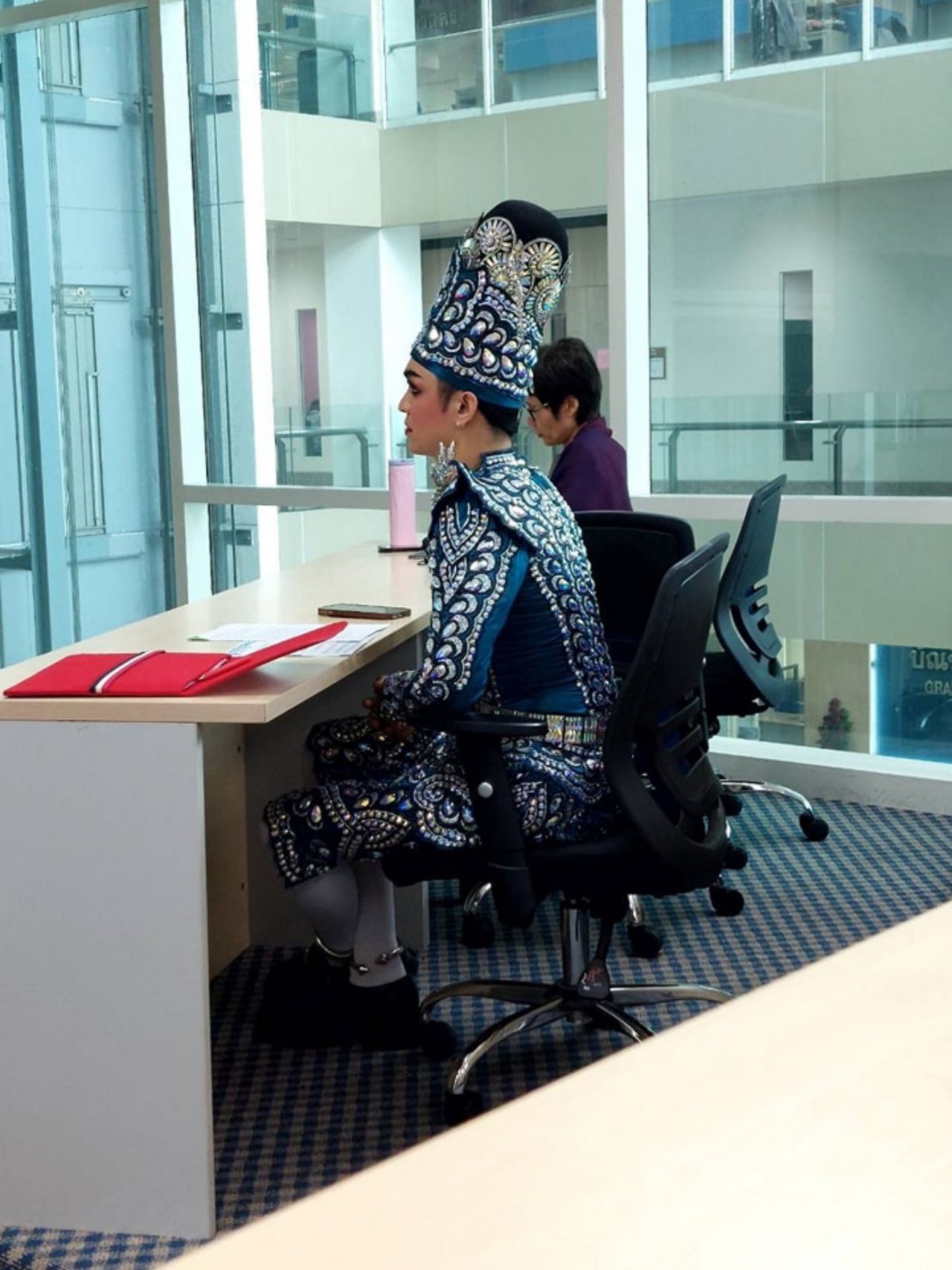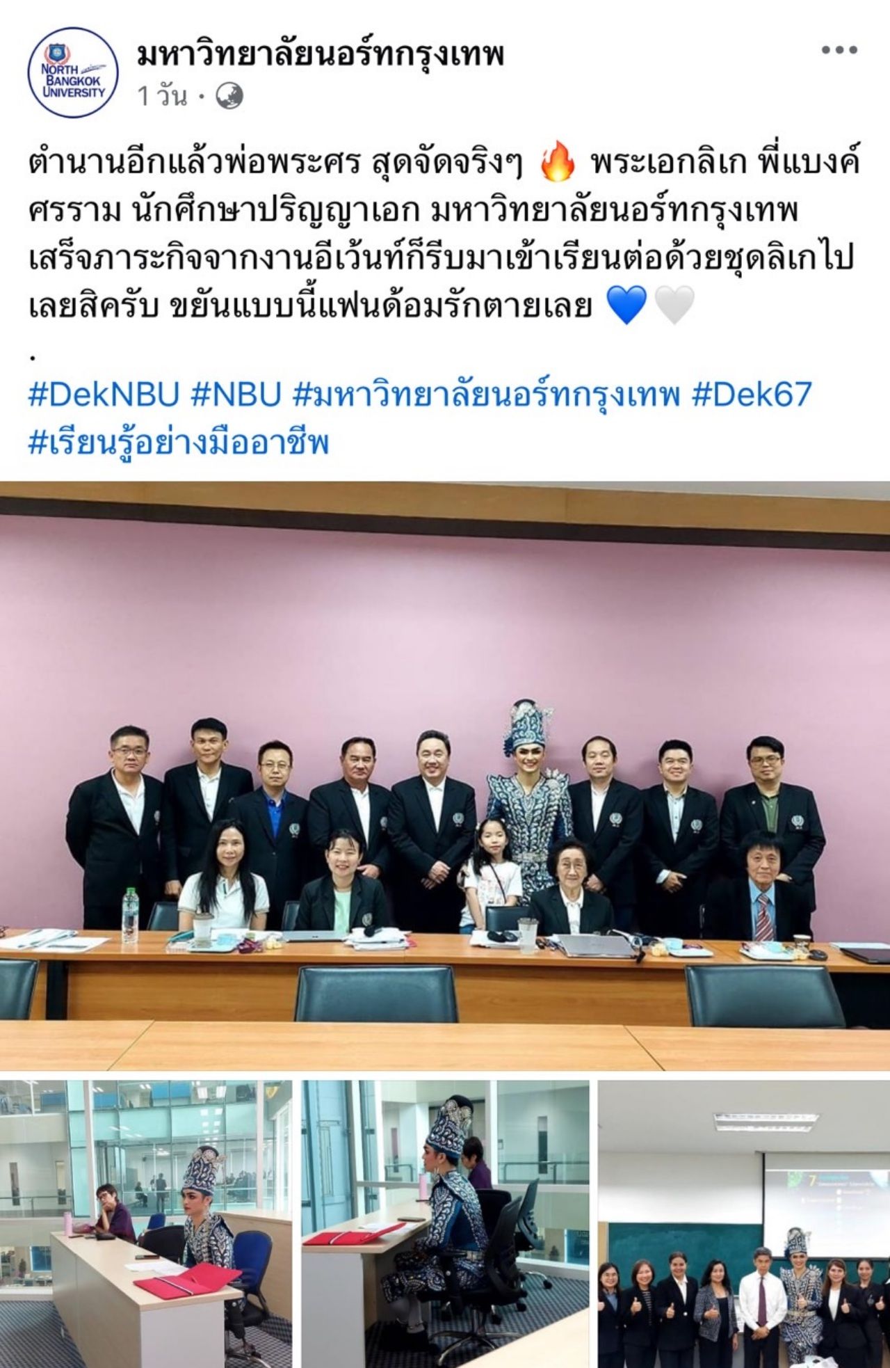 "ตำนานอีกแล้วพ่อพระศร สุดจัดจริงๆ พระเอกลิเก พี่แบงค์ ศรราม นักศึกษาปริญญาเอก มหาวิทยาลัยนอร์ทกรุงเทพ เสร็จภารกิจจากงานอีเวนต์ก็รีบมาเข้าเรียนต่อด้วยชุดลิเกไปเลยสิครับ ขยันแบบนี้แฟนด้อมรักตายเลย"