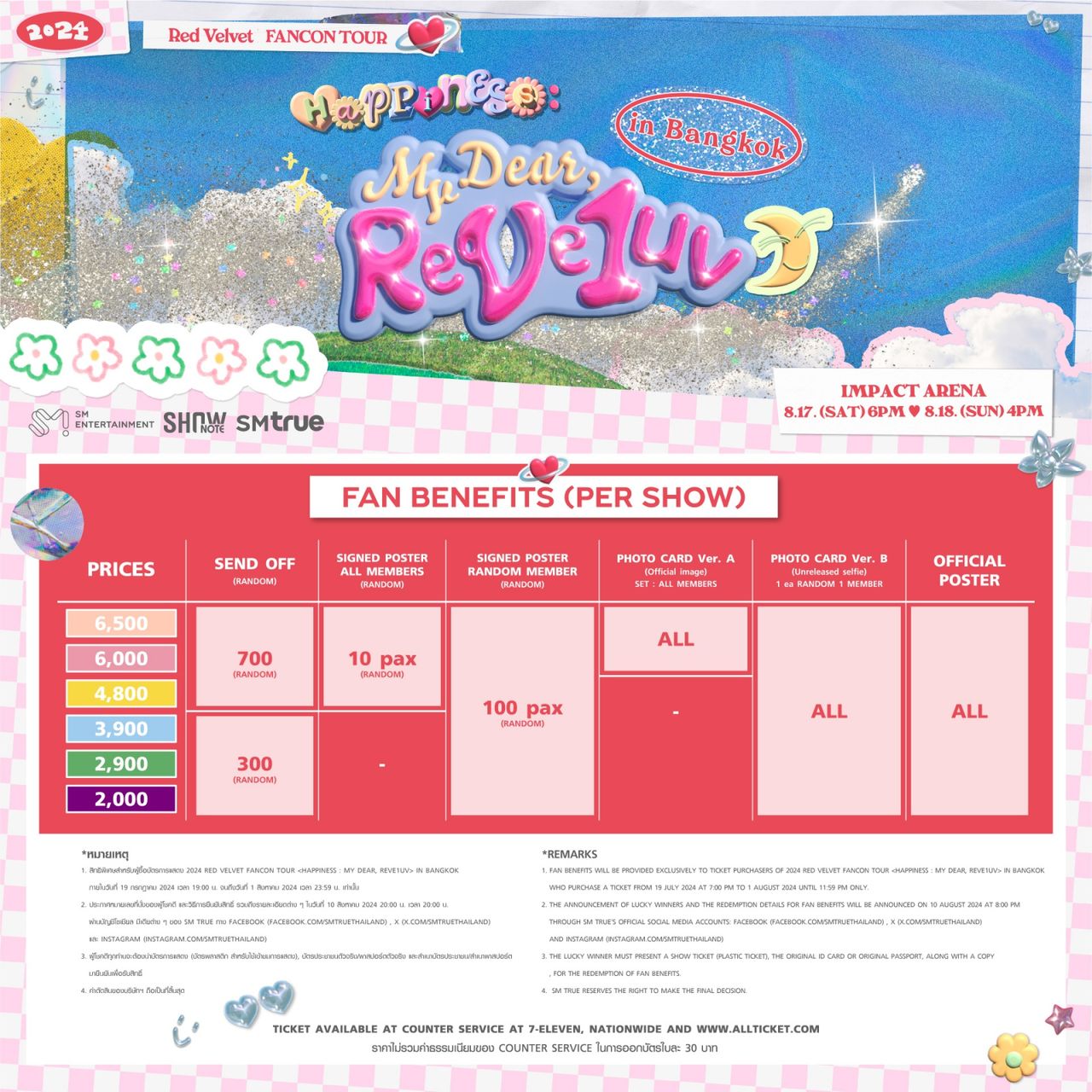 www.allticket.com/event/RedVelvet_FANCON_TOUR_in_BANGKOK บัตรนั่งราคา 6,500 / 6,000 / 4,800 / 3,900 / 2,900 / 2,000 บาท พร้อมสิทธิพิเศษสำหรับผู้ซื้อบัตร ติดตามข่าวสารและรายละเอียดเพิ่มเติมได้ทางบัญชีโซเชียลมีเดียต่างๆ ของ SM True : เฟซบุ๊ก facebook.com/smtruethailand, อินสตาแกรม instagram.com/smtruethailand และเอ็กซ์ x.com/SMTrueThailand สอบถามข้อมูลเพิ่มเติมเกี่ยวกับการซื้อบัตรได้ทาง Counter Service : อีเมล support@allticket.com และไลน์ @counterservice