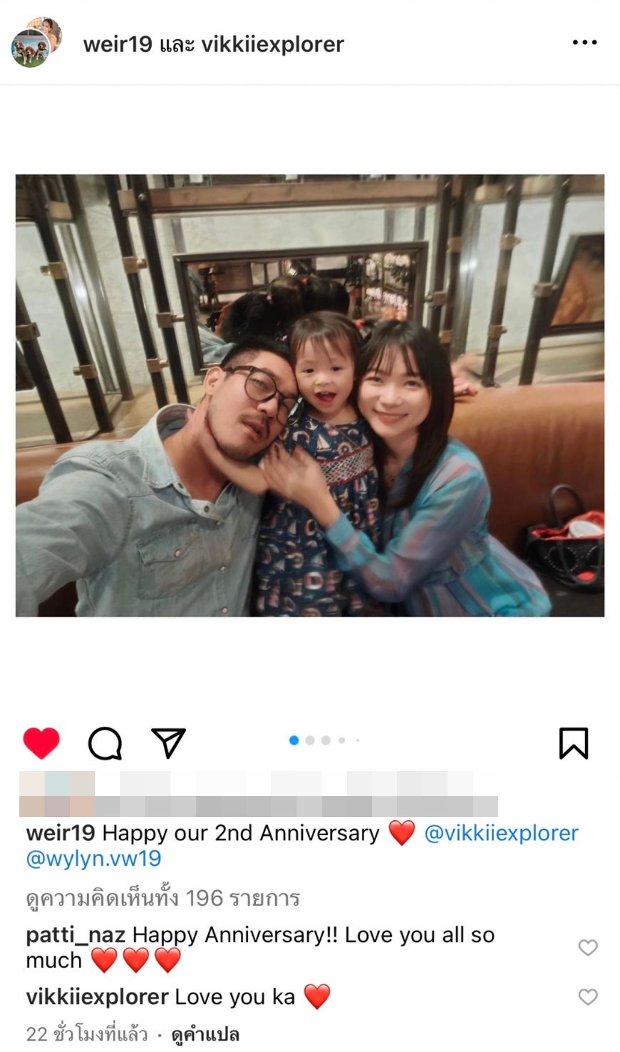 และล่าสุดในวันครบรอบแต่งงาน 2 ปีของ เวียร์กับวิกกี้ ทั้งคู่ได้พาลูกสาวไปทานอาหารที่ร้านกันแบบเรียบง่าย แต่ดูอบอุ่นมาก น้องวิริน ไม่งอแงเลย ดูเอ็นจอยกับพ่อแม่แบบสุดๆ ซึ่ง เวียร์ ก็ได้โพสต์ภาพน่ารักๆ ลงอินสตาแกรม พร้อมเขียนแคปชั่นว่า "Happy our 2nd Anniversary @vikkiiexplorer @wylyn.vw19"