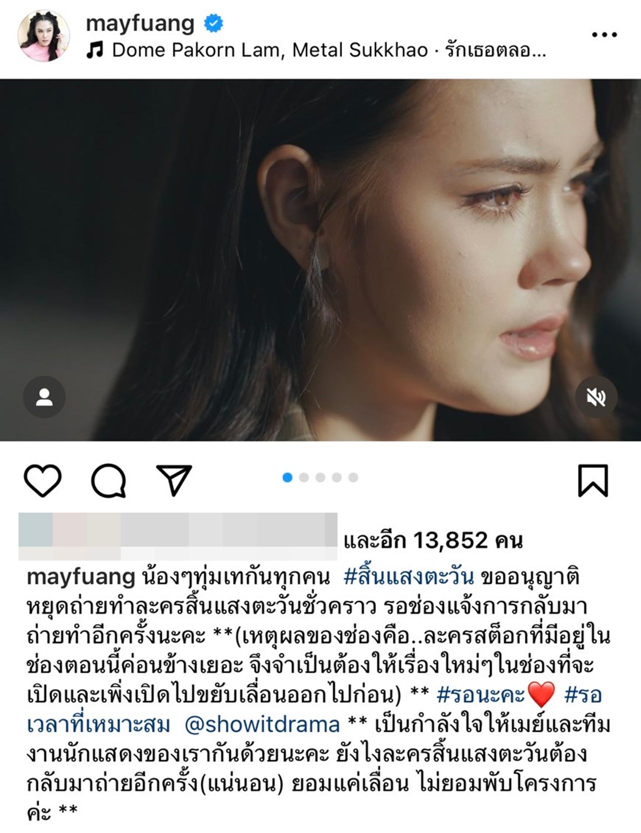 โดย เมย์ ได้โพสต์ภาพผ่านอินสตาแกรม พร้อมเขียนข้อความว่า "น้องๆทุ่มเทกันทุกคน #สิ้นแสงตะวัน ขออนุญาตหยุดถ่ายทำละครสิ้นแสงตะวันชั่วคราว รอช่องแจ้งการกลับมาถ่ายทำอีกครั้งนะคะ **(เหตุผลของช่องคือ..ละครสต็อกที่มีอยู่ในช่องตอนนี้ค่อนข้างเยอะ จึงจำเป็นต้องให้เรื่องใหม่ๆในช่องที่จะเปิดและเพิ่งเปิดไปขยับเลื่อนออกไปก่อน) ** #รอนะคะ #รอเวลาที่เหมาะสม @showitdrama ** เป็นกำลังใจให้เมย์และทีมงานนักแสดงของเรากันด้วยนะคะ ยังไงละครสิ้นแสงตะวันต้องกลับมาถ่ายอีกครั้ง(แน่นอน) ยอมแค่เลื่อน ไม่ยอมพับโครงการค่ะ **"