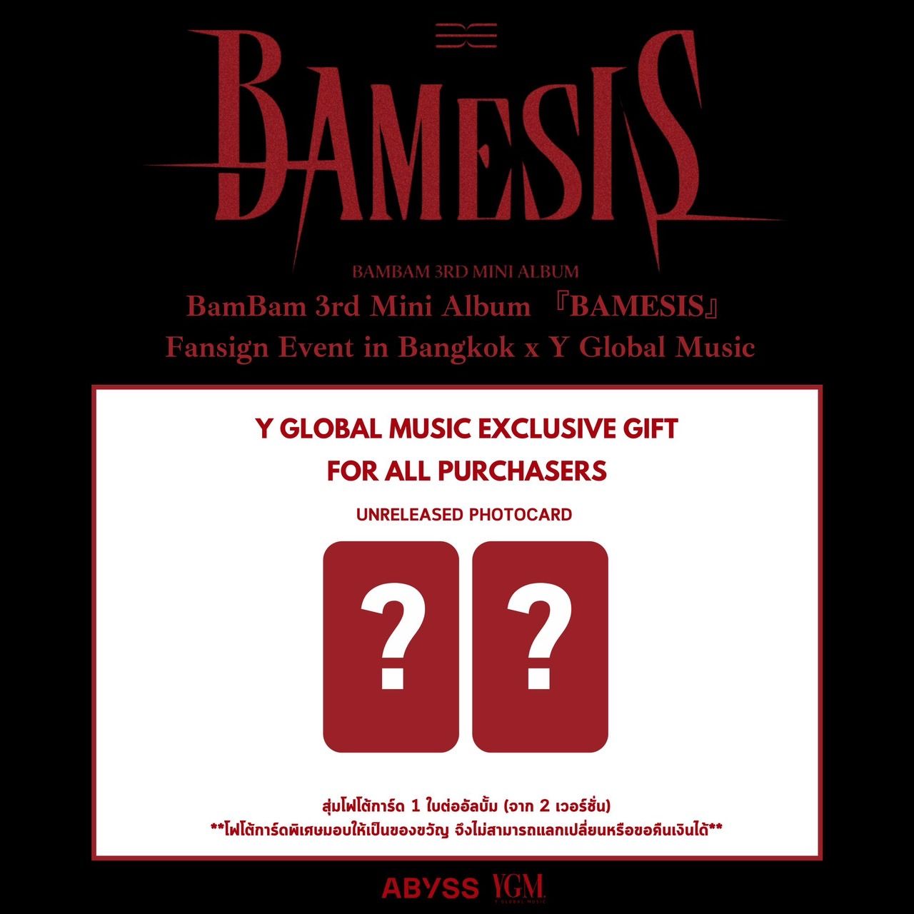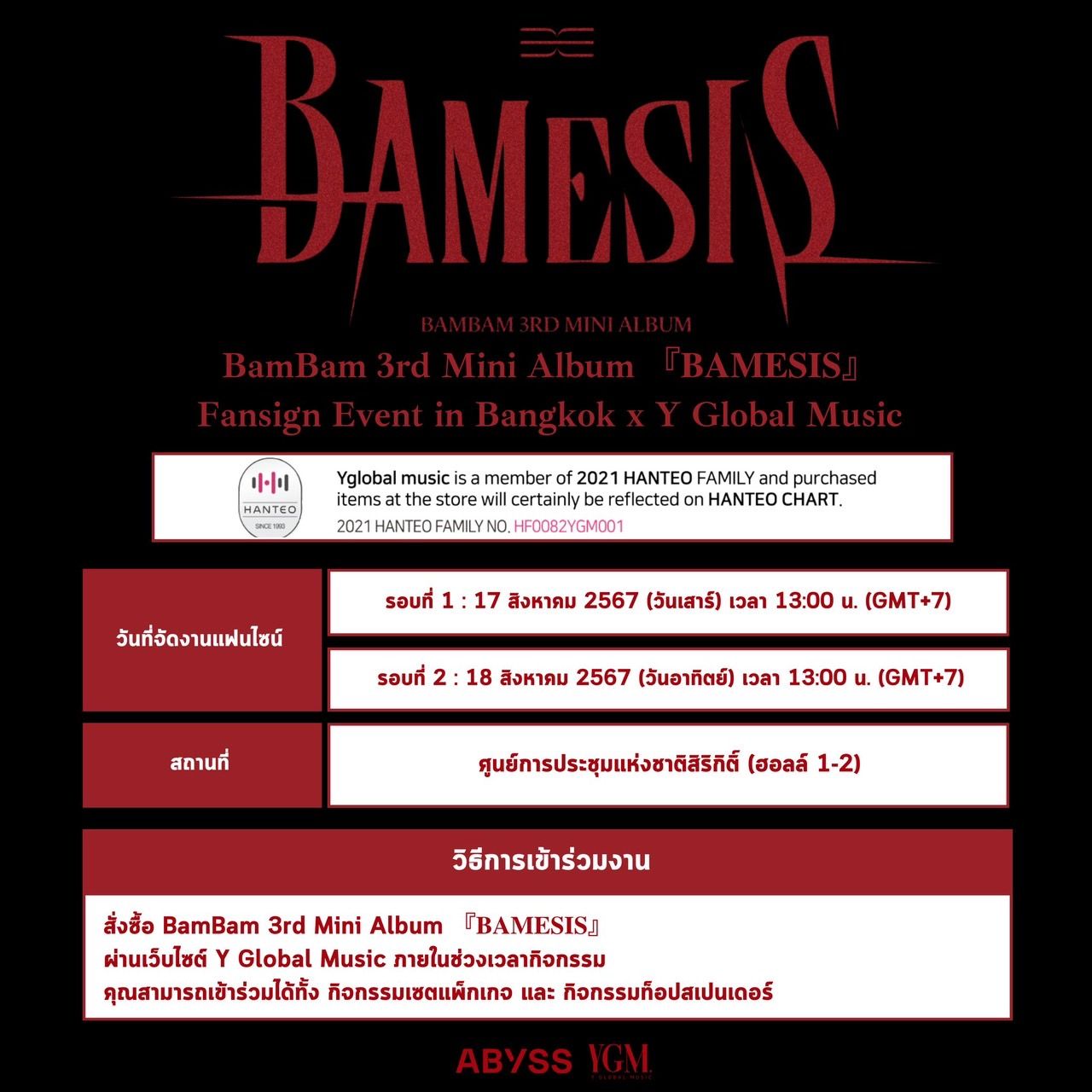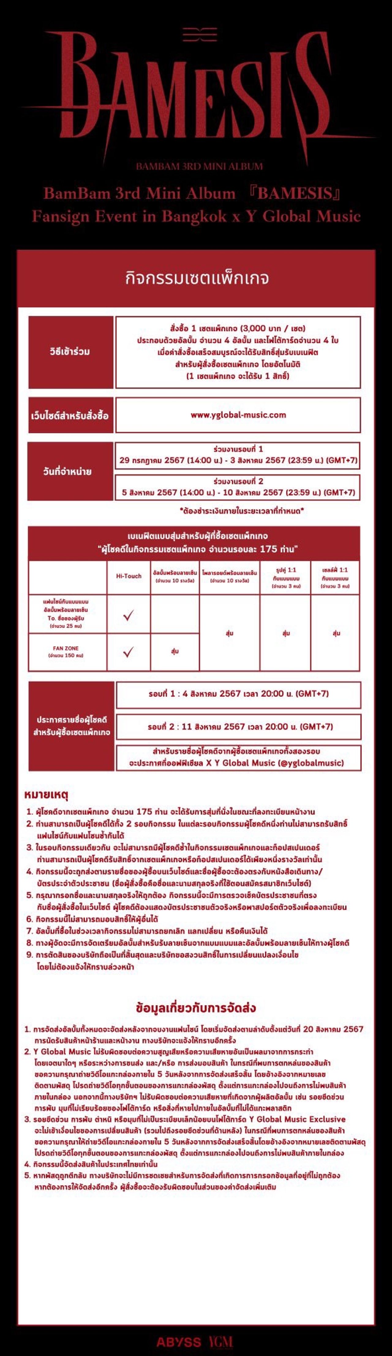 งานนี้หนุ่มแบมแบม ก็ไม่รอช้าสานต่อแรงหวีดของแฟนคลับไทยทันที ประกาศ 2 งานให้ทุกคนได้มาเจอกันอย่างใกล้ชิด กับกิจกรรมแฟนไซน์ “BamBam 3rd Mini Album (BAMESIS) Fansign Event in Bangkok x Y Global Music” ในวันเสาร์ และอาทิตย์ที่ 17-18 สิงหาคม เวลา 13.00 น. ณ ศูนย์ประชุมแห่งชาติสิริกิติ์ (ฮอลล์ 1-2) สิทธิพิเศษแน่นๆ