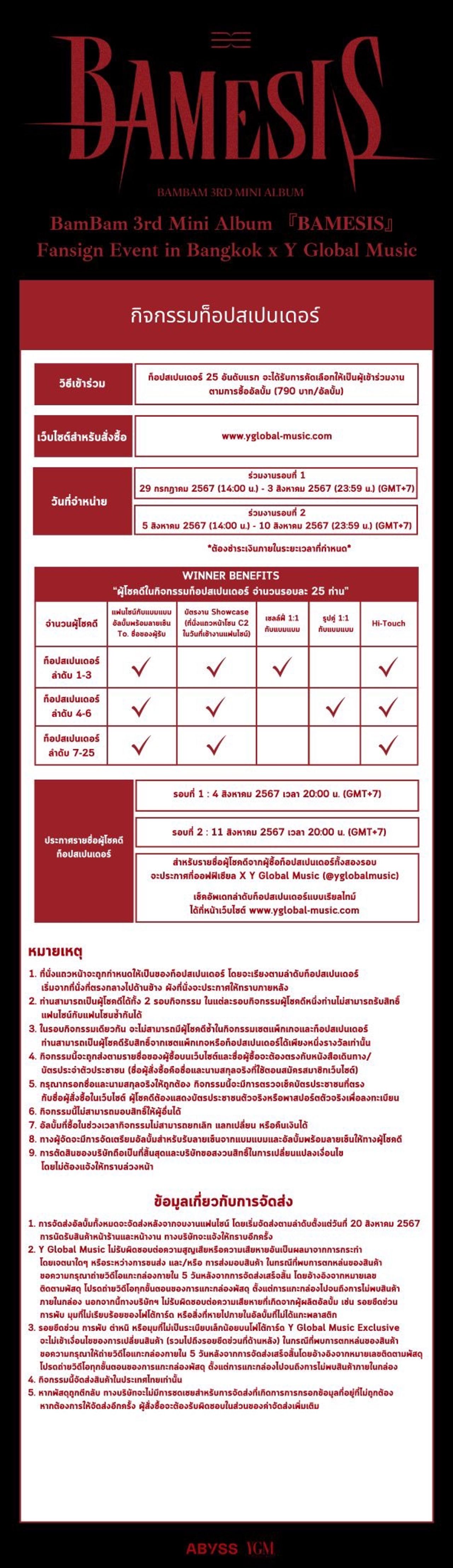 แฟนคลับเตรียมวอร์มเสียงมากรี๊ด วอร์มร่างกายมาแดนซ์ให้สุดเหวี่ยงไปกับน้องชายแห่งชาติ แบมแบม ที่พร้อมมากถึงมากที่สุดกับงานครั้งนี้!! ติดตามรายละเอียดเพิ่มเติมของกิจกรรมแฟนไซน์ และงานโชว์เคสได้ที่ Facebook และ X : Y Global Music