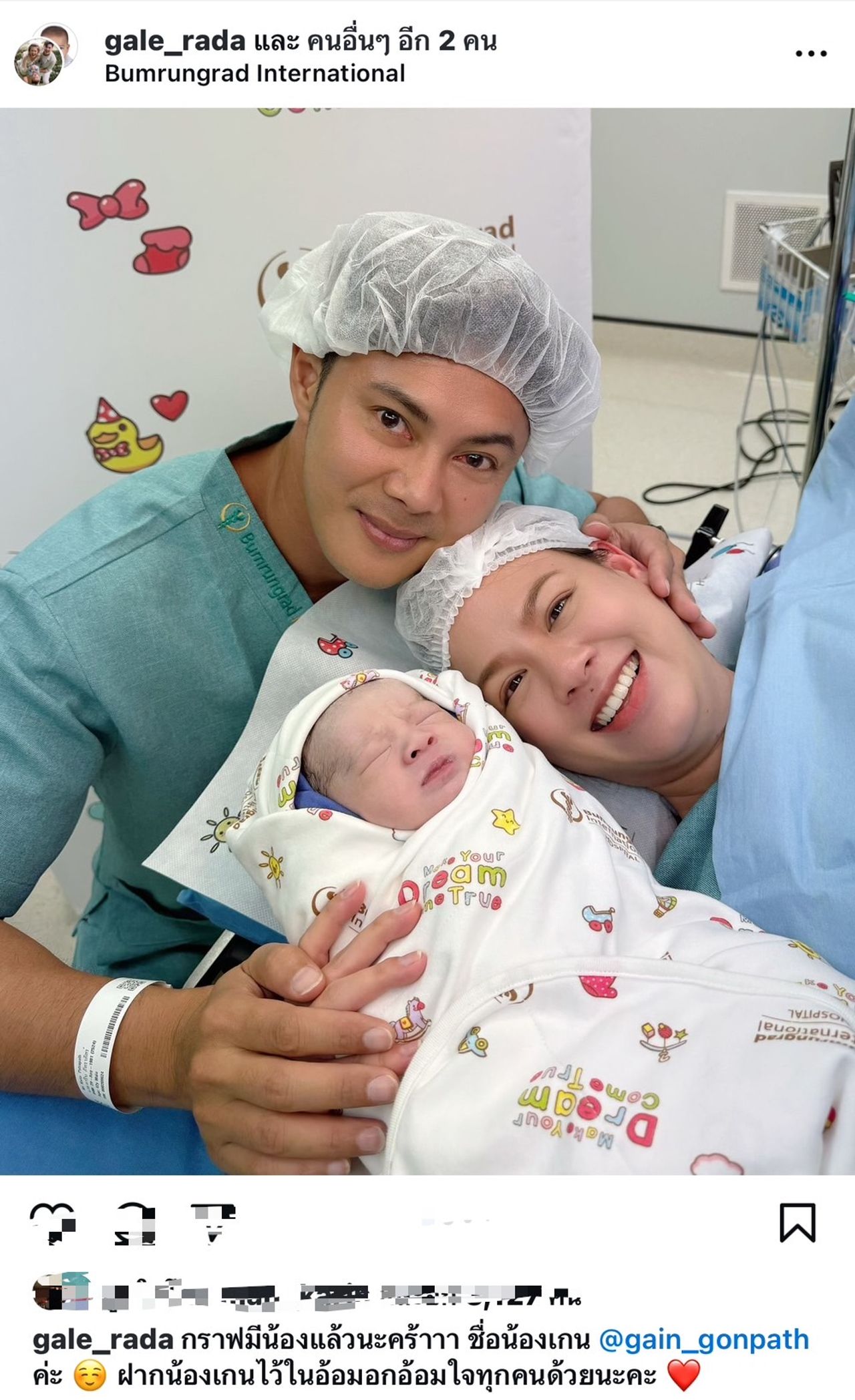 โดยคุณพ่ออย่าง แมน การิน ได้เผยภาพแรกของครอบครัวพร้อมหน้ากัน พร้อมกับข้อความสุดซึ้งถึงภรรยาไว้ด้วยว่า "@gale_rada กราฟมีน้องแล้วนะคร้าาา ชื่อน้องเกน @gain_gonpath ค่ะ ฝากน้องเกนไว้ในอ้อมอกอ้อมใจทุกคนด้วยนะคะ"