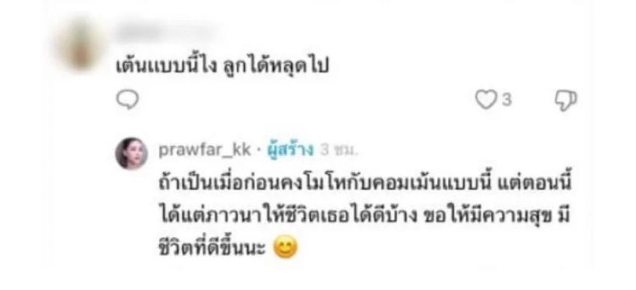 งานนี้ทำเอาสาว พราวฟ้า ถึงกับเดือดขั้นสุด และฟาดกลับนิ่มๆ บอกว่า "ถ้าเป็นเมื่อก่อนคงโมโหกับคอมเมนต์แบบนี้ แต่ตอนนี้ได้แต่ภาวนาให้ชีวิตเธอได้ดีบ้าง ขอให้มีความสุข มีชีวิตที่ดีขึ้นนะ"