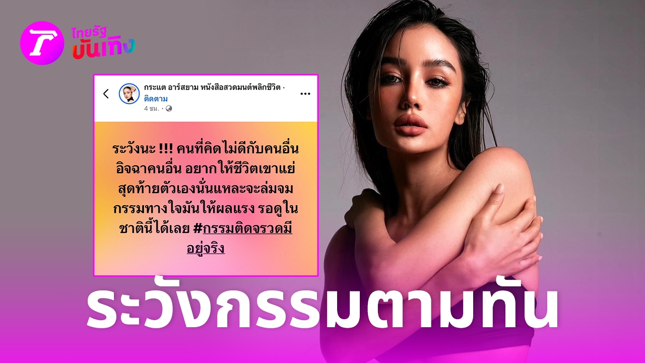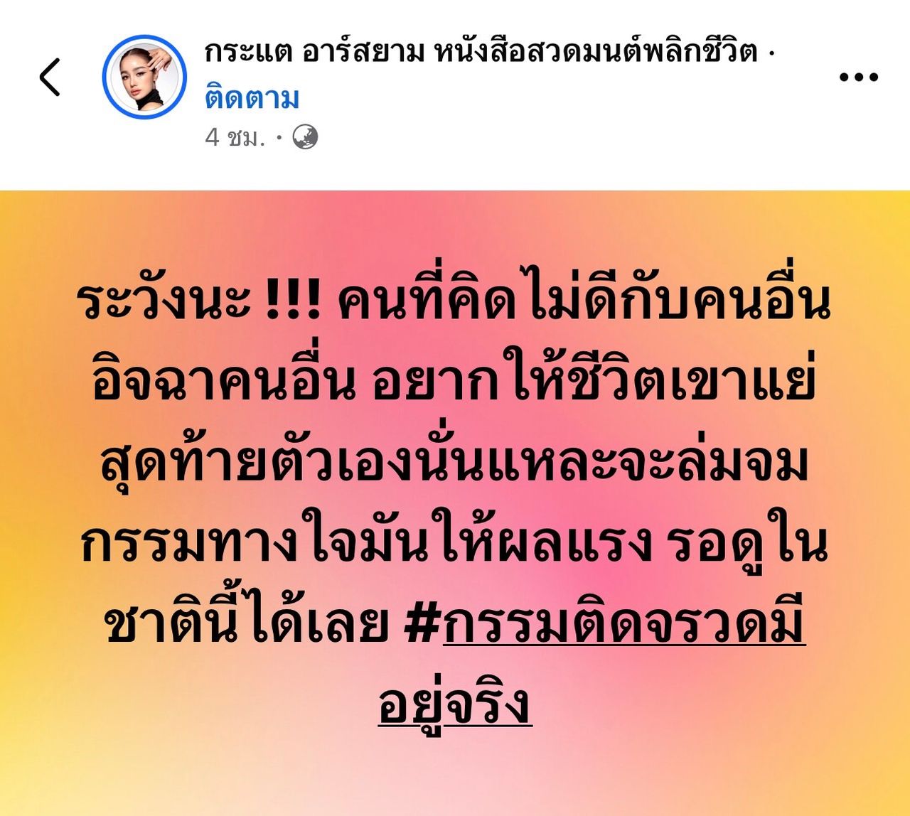 โดยข้อความดังกล่าวระบุว่า "ระวังนะ !!! คนที่คิดไม่ดีกับคนอื่น อิจฉาคนอื่น อยากให้ชีวิตเขาแย่ สุดท้ายตัวเองนั่นแหละจะล่มจม กรรมทางใจมันให้ผลแรง รอดูในชาตินี้ได้เลย #กรรมติดจรวดมีอยู่จริง" ท่ามกลางชาวเน็ตที่เข้ามากดไลค์กดแชร์กันเป็นจำนวนมาก