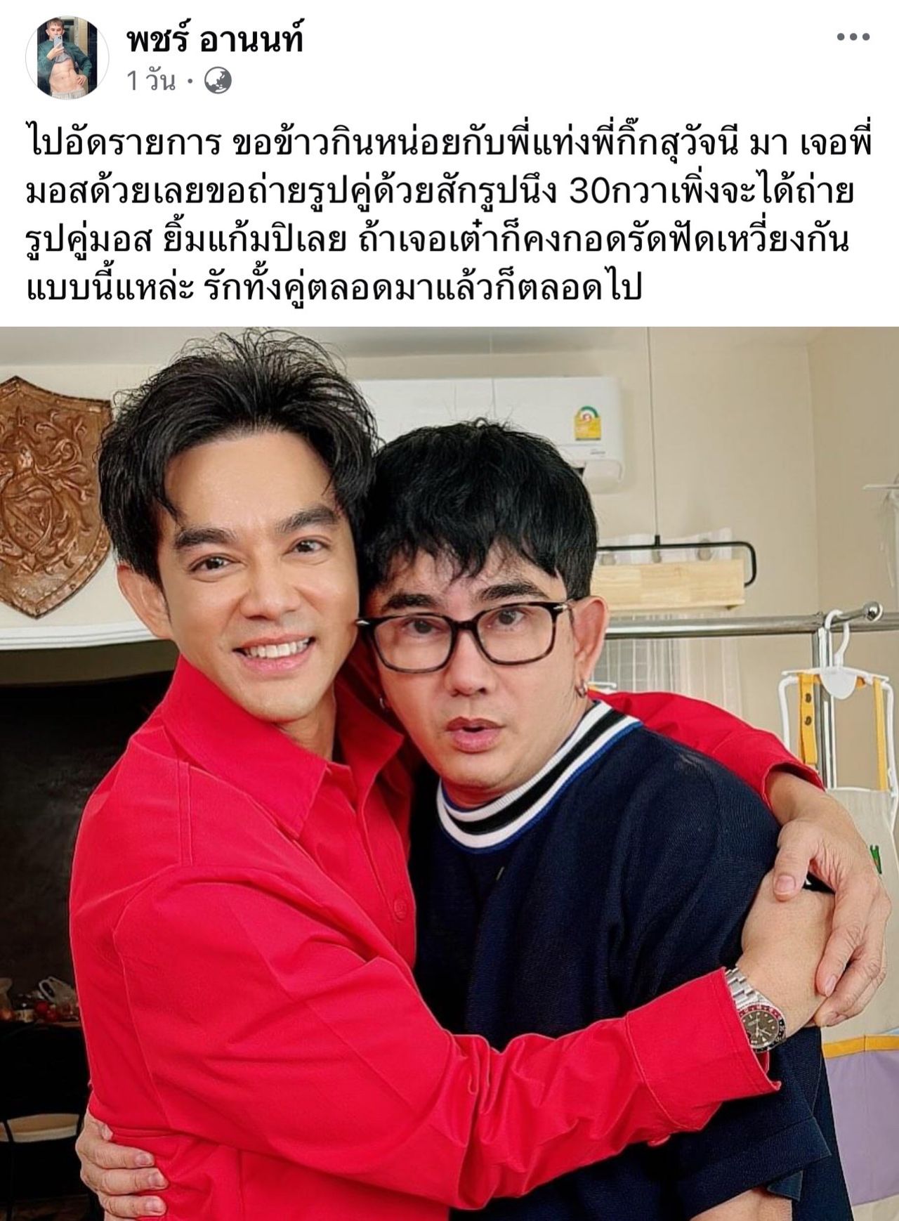 ล่าสุด พชร์ อานนท์ แมวมองตาเพชรผู้ที่เคยปลุกปั้นไอดอลยุค 90 ทั้งเต๋าและมอสก็ได้โพสต์ภาพคู่กับมอสลงโซเชียลพร้อมเอ่ยถึงเต๋าว่า “ไปอัดรายการ ขอข้าวกินหน่อยกับ พี่แท่ง พี่กิ๊ก สุวัจนี มา เจอพี่มอสด้วยเลยขอถ่ายรูปคู่ด้วยสักรูปนึง 30 กว่า เพิ่งจะได้ถ่ายรูปคู่มอส ยิ้มแก้มปริเลย ถ้าเจอเต๋าก็คงกอดรัดฟัดเหวี่ยงกันแบบนี้แหละ รักทั้งคู่ตลอดมาแล้วก็ตลอดไป”
