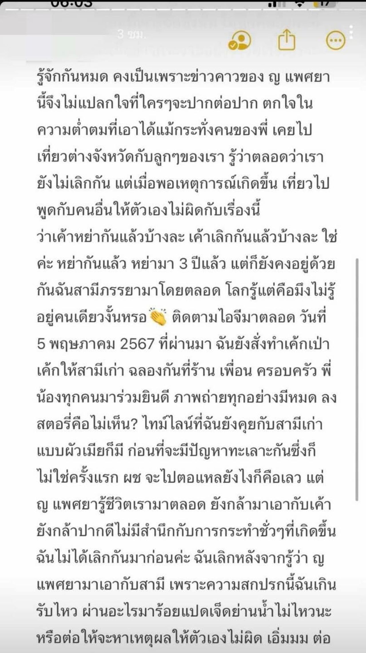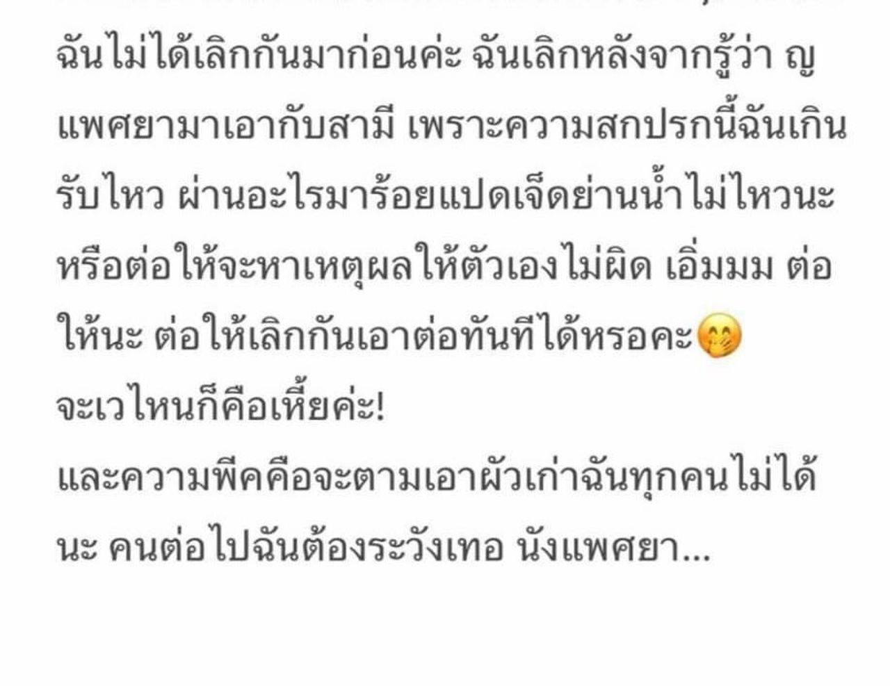 ต่อมา เพจเจ๊มอย ได้ออกมาเปิดเผยเพิ่มเติมว่า "ความสัมพันธ์ของดาราหน้าเก๋และเมียหลวง ทำไมมันซับซ้อนจังวะ ผัวคนแรกของเมียหลวง ดาราหน้าเก๋ก็เคยคบ พอเมียหลวงมีผัวคนที่ 2 แล้วเลิก!! ดาราหน้าเก๋ก็สานต่อ ต้องเกิดมาจากสังคมแบบไหน.. ถึงไม่แคร์ใดใด แล้วกินต่อคนอื่นแบบนี้นะ?