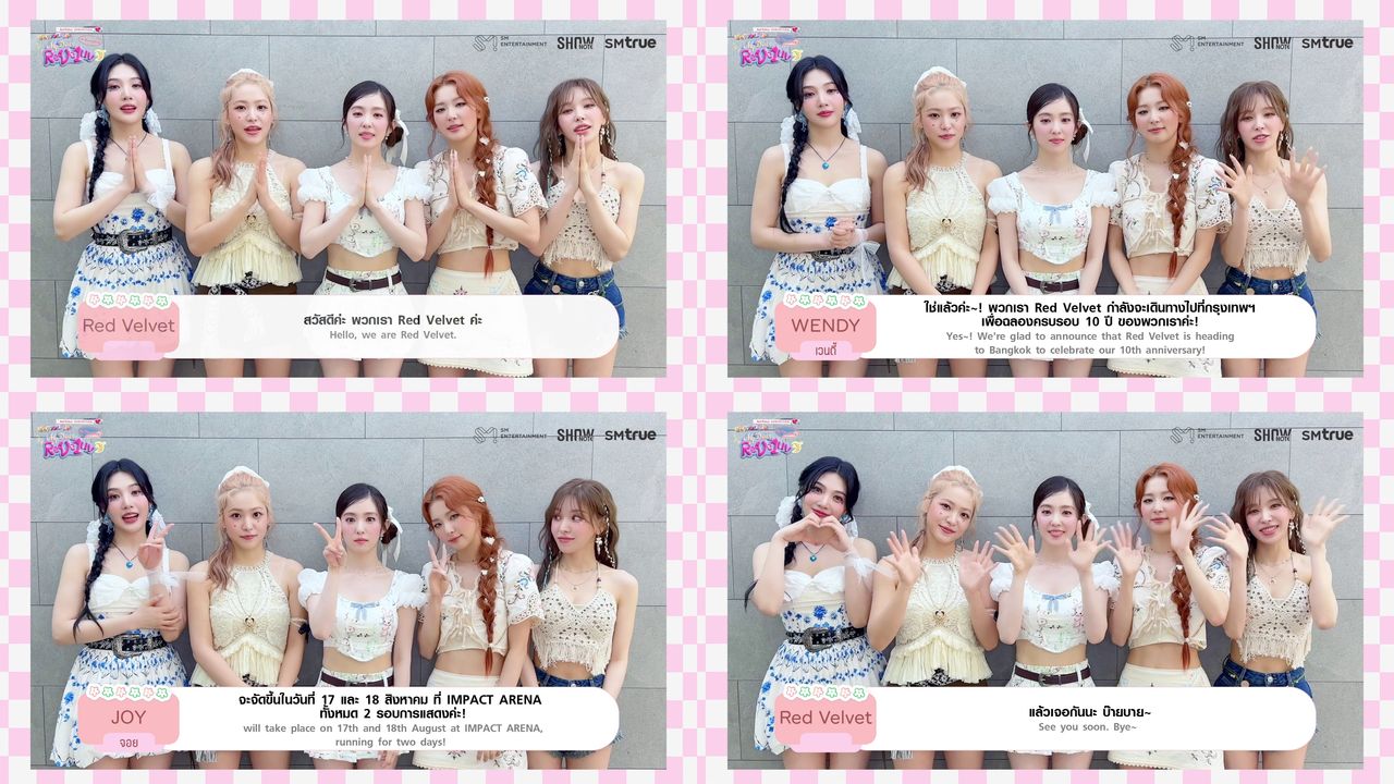 โดยพวกเธอได้ส่งคลิปทักทายมาแจ้งข่าวดีกับแฟนๆ ดังนี้ "สวัสดีค่ะ พวกเรา Red Velvet ค่ะ ReVeluv ชาวไทย สบายดีไหมคะ? พวกเรามีข่าวดีมากๆ มาแจ้งกับ ReVeluv ชาวไทยค่ะ พวกเรา Red Velvet กำลังจะเดินทางไปที่กรุงเทพฯ เพื่อฉลองครบรอบ 10 ปี ของพวกเราค่ะ