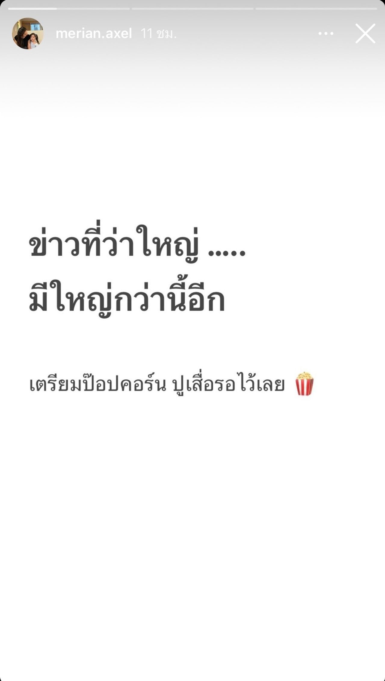 แต่ล่าสุดทำเอาชาวเน็ตที่ชอบใส่ใจถึงกับตาโต เมื่อมีเรียนได้ออกมาโพสต์ข้อความปริศนาผ่านทางไอจีสตอรี่ของตัวเอง ซึ่งมีข้อความว่า “ข่าวที่ว่าใหญ่…..มีใหญ่กว่านี้อีก เตรียมป๊อปคอร์น ปูเสื่อรอไว้เลย”