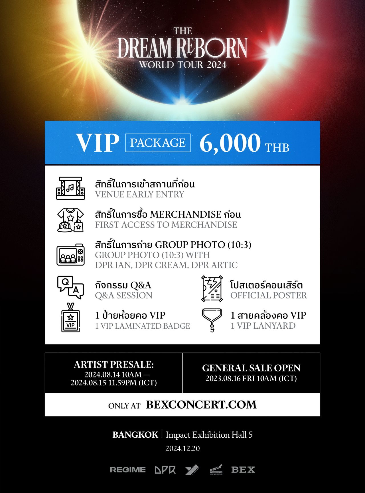 และเพื่อเป็นของขวัญส่งท้ายปีให้กับ DREAMers (ดรีมเมอร์: ชื่อกลุ่มแฟนคลับ) ชาวไทย ผู้จัดอย่าง “BEX” บริษัทอีเวนต์ออแกไนเซอร์ในเครือเวิร์คพอยท์กรุ๊ป ร่วมกับ “YJ PARTNERS” และ “PROUD2” ก็ไม่รอช้า คว้าตัวทั้ง 3 หนุ่ม “DPR +IAN” (ศิลปินแนว Pop, R&B, Rock และ Electronica) / “DPR CREAM” (ศิลปินแนว Hiphop) และ “DPR ARTIC” (ศิลปินแนว House, Electronic และ Techno) บินลัดฟ้ามาที่ประเทศไทยกับงาน “THE DREAM REBORN WORLD TOUR 2024 IN BANGKOK” งานนี้ดรีมเมอร์ห้ามพลาดด้วยประการทั้งปวง เพราะการกลับมาประเทศไทยในครั้งนี้ หนุ่มๆ เตรียมโชว์สุดพิเศษมาฝากเพียบ!