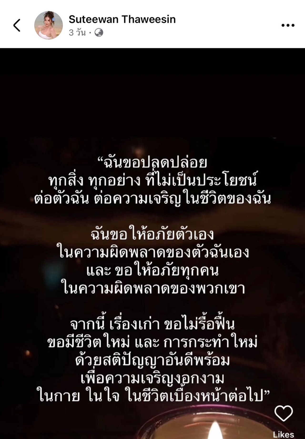 และคำคมอีกโพสต์ระบุว่า ""ฉันขอปลดปล่อยทุกสิ่ง ทุกอย่าง ที่ไม่เป็นประโยชน์ต่อตัวฉัน ต่อความเจริญในชีวิตของฉัน ฉันขอให้อภัยตัวเองในความผิดพลาดของตัวฉันเอง และ ขอให้อภัยทุกคนในความผิดพลาดของพวกเขา จากนี้ เรื่องเก่า ขอไม่รื้อฟื้น ขอมีชีวิตใหม่ และ การกระทำใหม่ ด้วยสติปัญญาอันดีพร้อม เพื่อความเจริญงอกงามในกาย ในใจ ในชีวิตเบื้องหน้าต่อไป"
