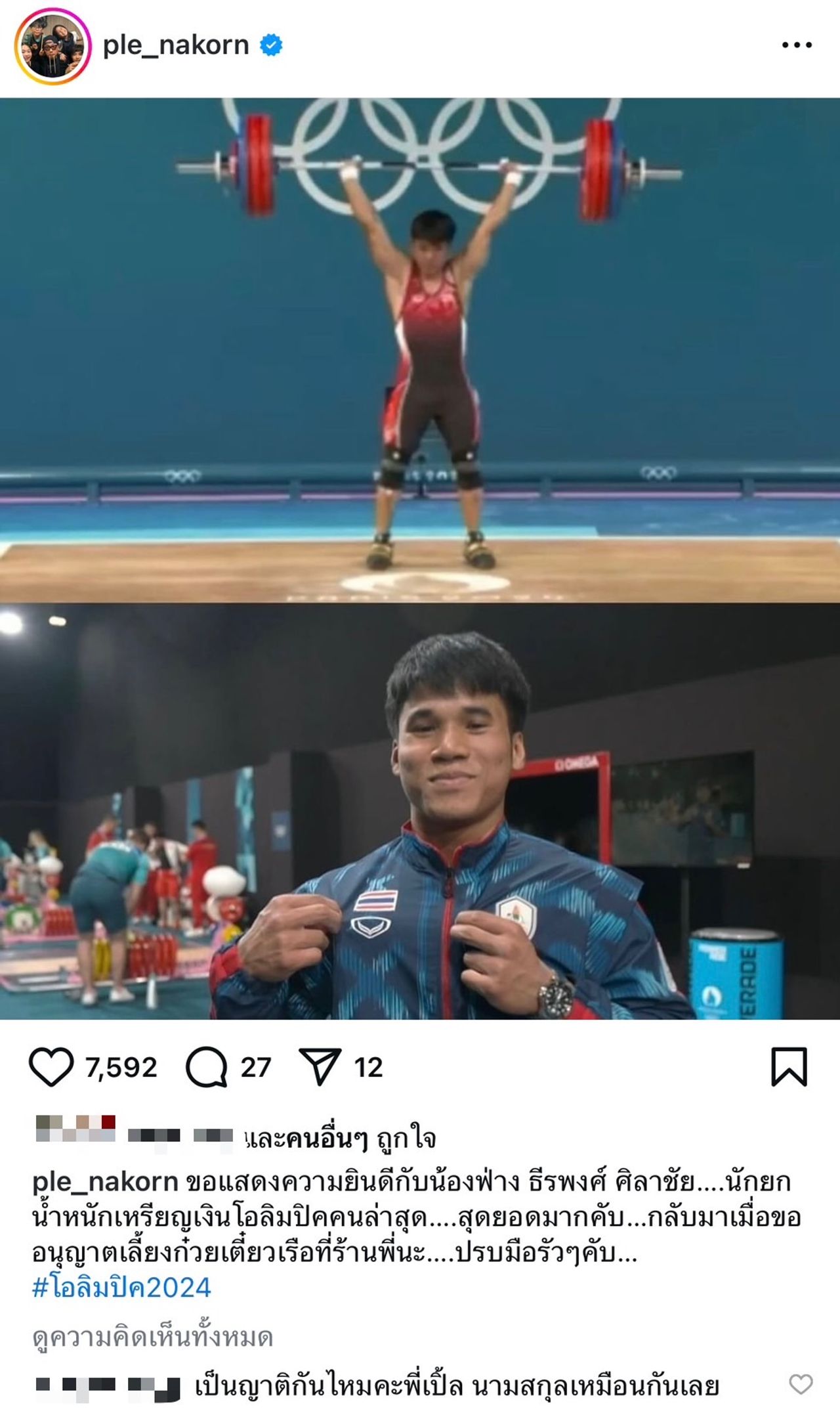 พร้อมระบุแคปชั่นว่า "ขอแสดงความยินดีกับน้องฟ่าง ธีรพงศ์ ศิลาชัย….นักยกน้ำหนักเหรียญเงินโอลิมปิกคนล่าสุด….สุดยอดมากคับ…กลับมาเมื่อขออนุญาตเลี้ยงก๋วยเตี๋ยวเรือที่ร้านพี่นะ….ปรบมือรัวๆคับ…#โอลิมปิก2024"