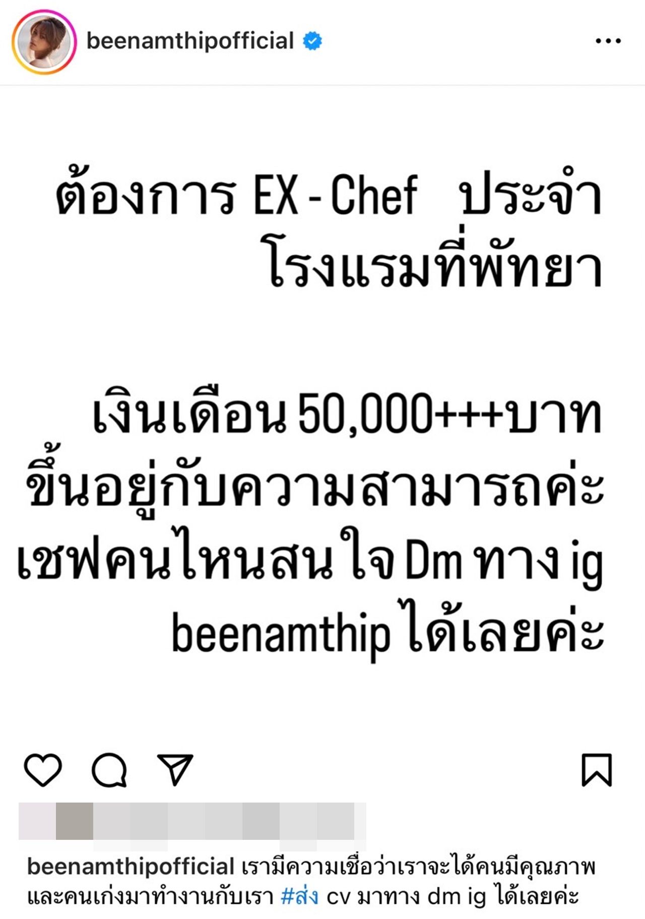 "ต้องการ EX-chef ประจำโรงแรมที่พัทยา เงินเดือน 50,000+++บาท ขึ้นอยู่กับความสามารถค่ะ เชฟคนไหนสนใจ Dm ทาง ig beenamthip ได้เลยค่ะ" และเขียนแคปชั่นเพิ่มเติมว่า "เรามีความเชื่อว่าเราจะได้คนมีคุณภาพและคนเก่งมาทำงานกับเรา #ส่ง cv มาทาง dm ig ได้เลยค่ะ"
