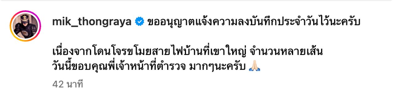 "ขออนุญาตแจ้งความลงบันทึกประจำวันไว้นะครับ เนื่องจากโดนโจรขโมยสายไฟบ้านที่เขาใหญ่ จำนวนหลายเส้น วันนี้ขอบคุณพี่เจ้าหน้าที่ตำรวจ มากๆ นะครับ"