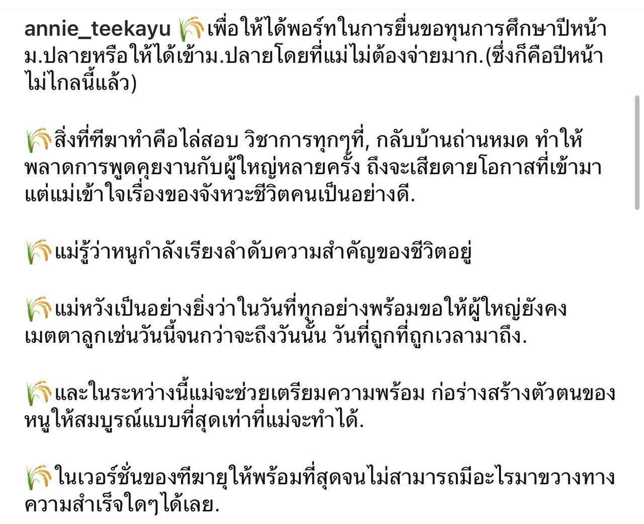 ล่าสุด แอนนี่ บรู๊ค ได้ออกมาร่ายยาวเผยความในใจผ่านอินสตาแกรมส่วนตัว เผยสิ่งที่ลูกชายต้องเสียสละเพื่อช่วยแบ่งเบาภาระแม่ โดยระบุว่า "เพื่อให้ได้พอร์ทในการยื่นขอทุนการศึกษาปีหน้า ม.ปลายหรือให้ได้เข้าม.ปลายโดยที่แม่ไม่ต้องจ่ายมาก.(ซึ่งก็คือปีหน้าไม่ไกลนี้แล้ว)