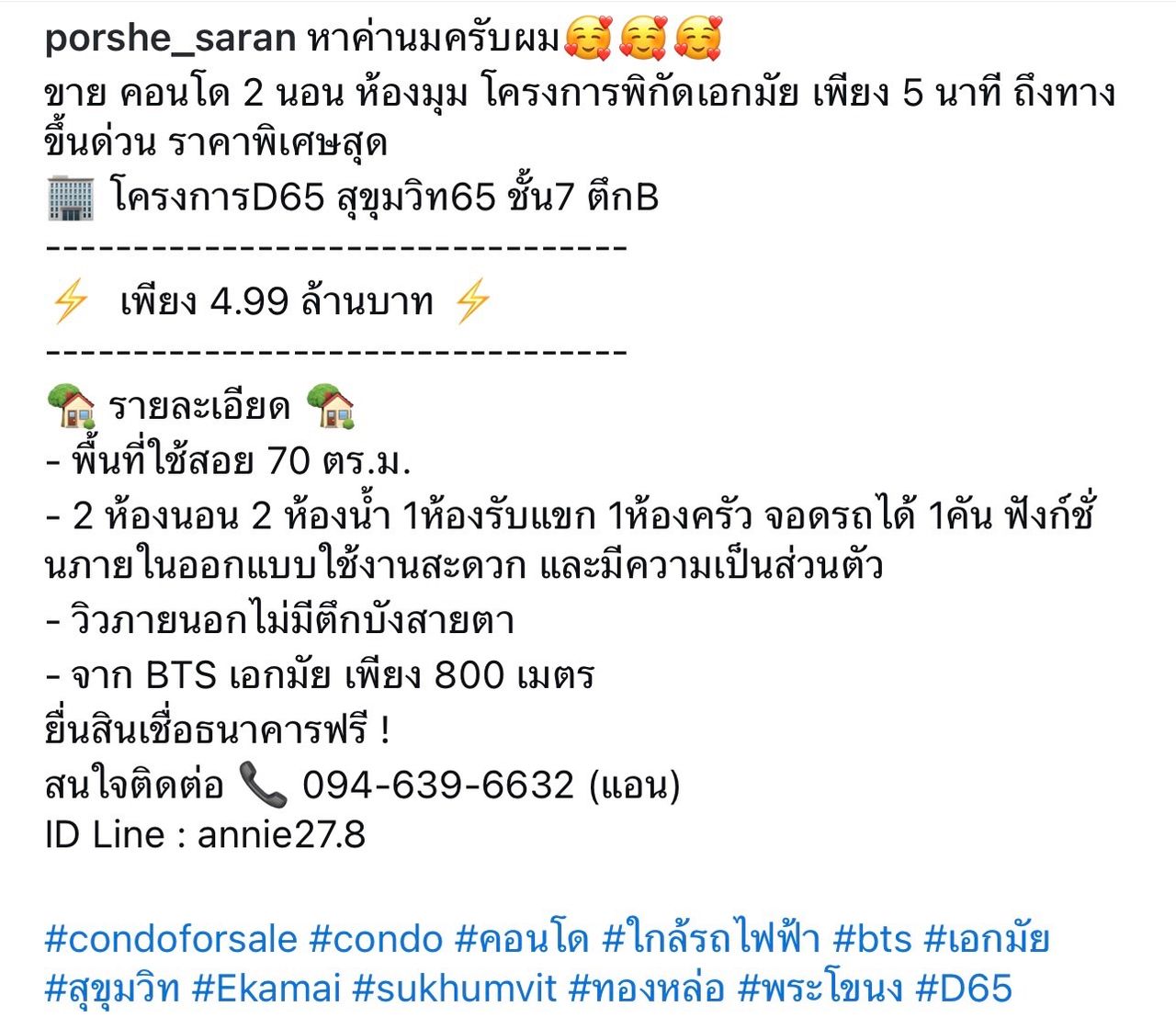 ล่าสุด พอร์ช ศรัณย์ ศิริลักษณ์ ได้ออกมาโพสต์ภาพพร้อมข้อความ โดยการตัดสินใจประกาศขายคอนโดหรู ย่านเอกมัย ผ่านทางอินสตาแกรมส่วนตัว พร้อมตั้งราคาที่ 4.99 ล้าน ที่ทำเอาคนรักบ้านต้องหูตาลุกวาวไปตามๆ กัน เพราะมันคุ้มมาก