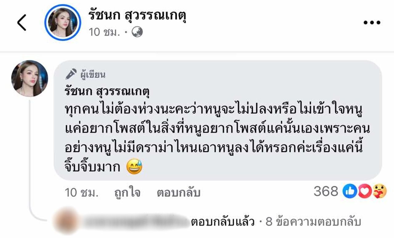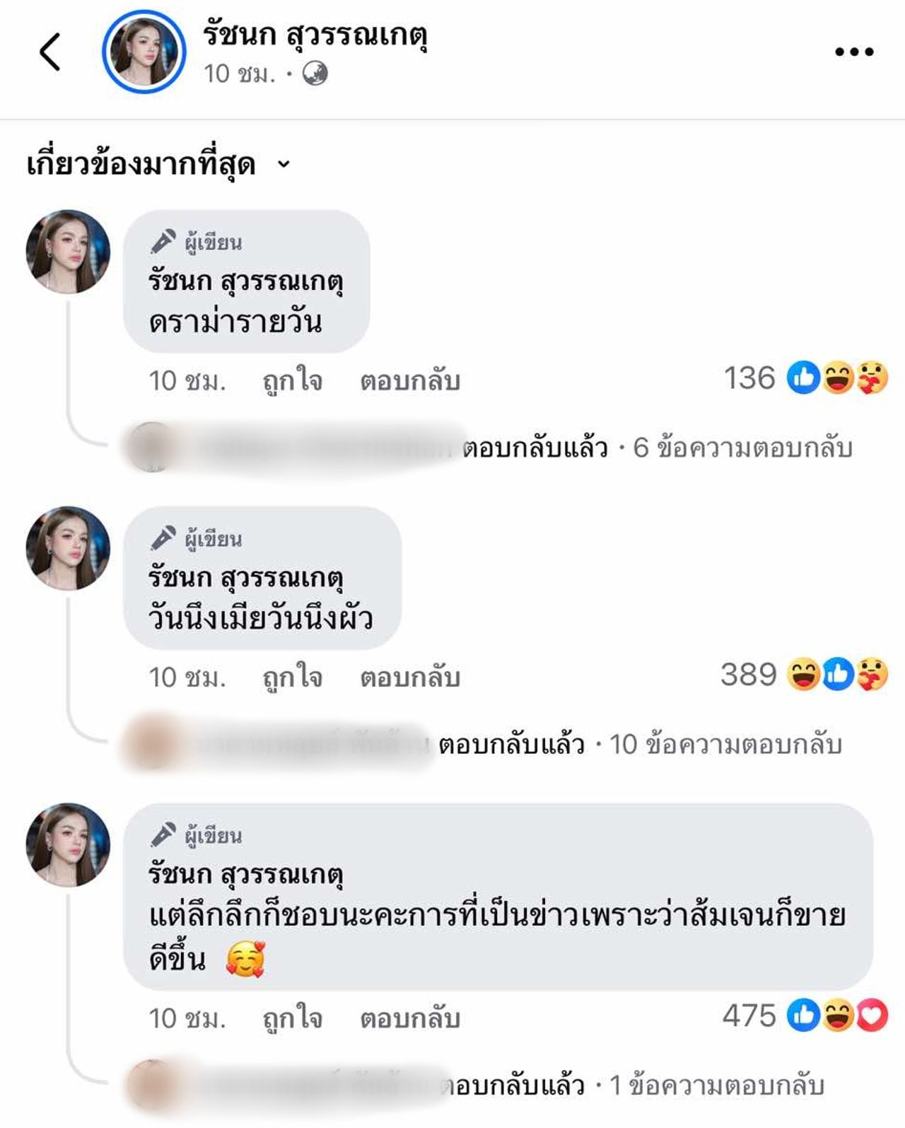 นอกจากนี้ เจนนี่ ยังคอมเมนต์เพิ่มเติมใต้โพสต์ไว้ว่า “ดราม่ารายวัน วันนึงเมียวันนึงผัว แต่ลึกๆ ก็ชอบนะคะการที่เป็นข่าวเพราะว่าส้มเจนก็ขายดีขึ้น แล้วช่วงนี้สามีบินไปต่างประเทศบ่อย เพราะฉะนั้นเลขาก็อาจจะต้องมีความรู้ความสามารถเกี่ยวกับภาษาอยู่บ้าง หรือถ้าไม่มีก็อาจจะพิจารณาเป็นพิเศษ ทุกคนไม่ต้องห่วงนะคะว่าหนูจะไม่ปลงหรือไม่เข้าใจ หนูแค่อยากโพสต์ในสิ่งที่หนูอยากโพสต์แค่นั้นเอง เพราะคนอย่างหนูไม่มีดราม่าไหนเอาหนูลงได้หรอกค่ะ เรื่องแค่นี้จิ๊บๆ มาก”.