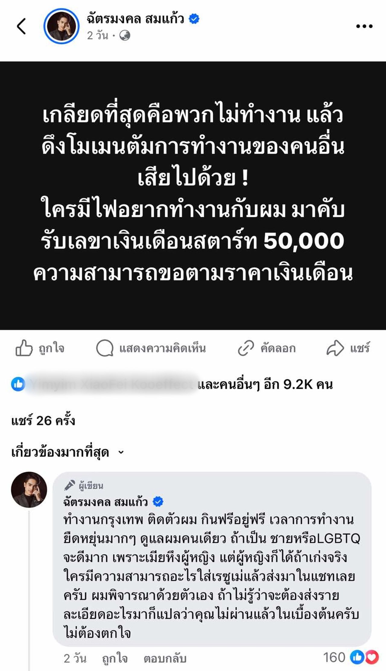 โดยบอกว่า “รับสมัครเลขา ติดตัวผม เงินเดือนเริ่มต้น 50,000 กินฟรีอยู่ฟรี กรุงเทพ ทักมาเลยผมพิจารณาด้วยตัวเอง เป็นรายคน งานเลขาผู้บริหาร ถ้ายังไม่รู้ว่าต้องส่งรายละเอียดอะไรมาก็แปลว่าไม่ผ่านแล้วตั้งแต่แรกครับ ไม่ต้อง งง”